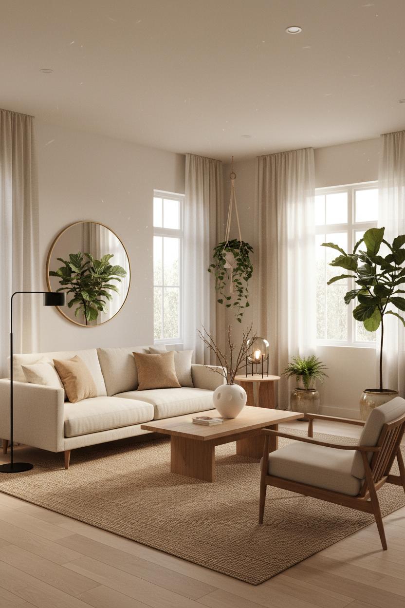 Let the windows do the heavy lifting. Hang curtains high and wide to frame the view and invite more daylight, and choose linen sheers so the sun feels dappled rather than dazzling. Bounce light by placing a mirror opposite a window and mixing matte woods with a few subtly reflective touches—glazed pottery, a glass lamp, even the curve of that ceramic vase. In the evenings, layer warm pools of light: a floor lamp near the reading chair, a petite table lamp on a side table, and dimmers on overheads so everything glows rather than glares. For indoor plants styling, think in rhythms—tall, medium, trailing. An indoor fiddle leaf fig in the corner draws the eye upward and softens architecture, while a tabletop fern and a small cascading pothos keep the gaze traveling. Tuck plants where they’ll catch light without blocking it, and cluster them in odd numbers for an easy, organic composition. Together with a textural jute rug, tactile linen throw pillows, and the grounded presence of an oak coffee table, the flow of light and layout will stay serene, sun-kissed, and quietly balanced.