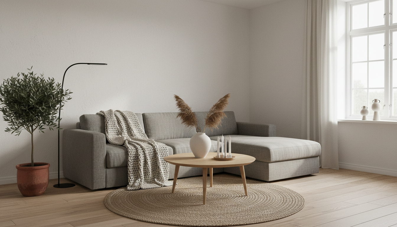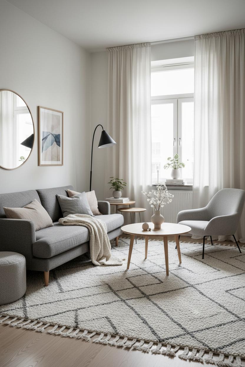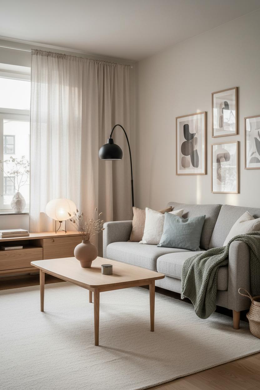 For walls and windows, long curtains hung high, plus a lean console or wall-mounted shelf, pull the eye upward to visually expand the room. A mirror opposite the window doubles light, while neutral wall art in soft, tonal palettes adds depth without shouting. Scandinavian decor thrives on pieces that do double duty: a storage bench as extra seating, a lidded ottoman for blankets, nested side tables that tuck away when not in use. Keep legs airy and profiles slender to maintain that minimalist living room silhouette, and choose finishes that whisper rather than shout—soaped woods, matte black, linen, and wool—so everything feels collected rather than cluttered. The result is a neutral home that feels serene but not sterile: warm textures underfoot, gentle curves for flow, and just enough contrast to keep the eye moving. With thoughtful scale and a few hardworking heroes, even the smallest space channels a bright, cozy Scandinavian living room you’ll love to come home to.