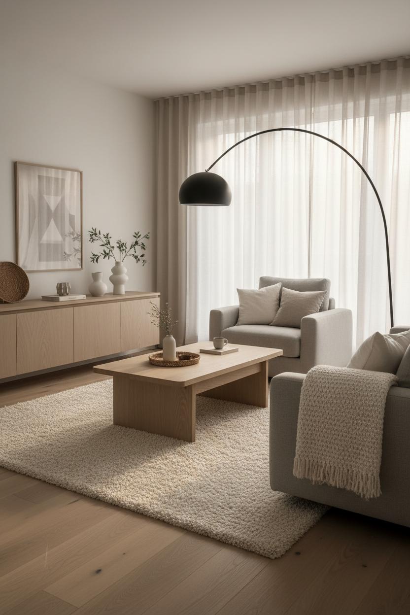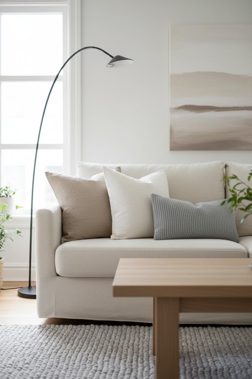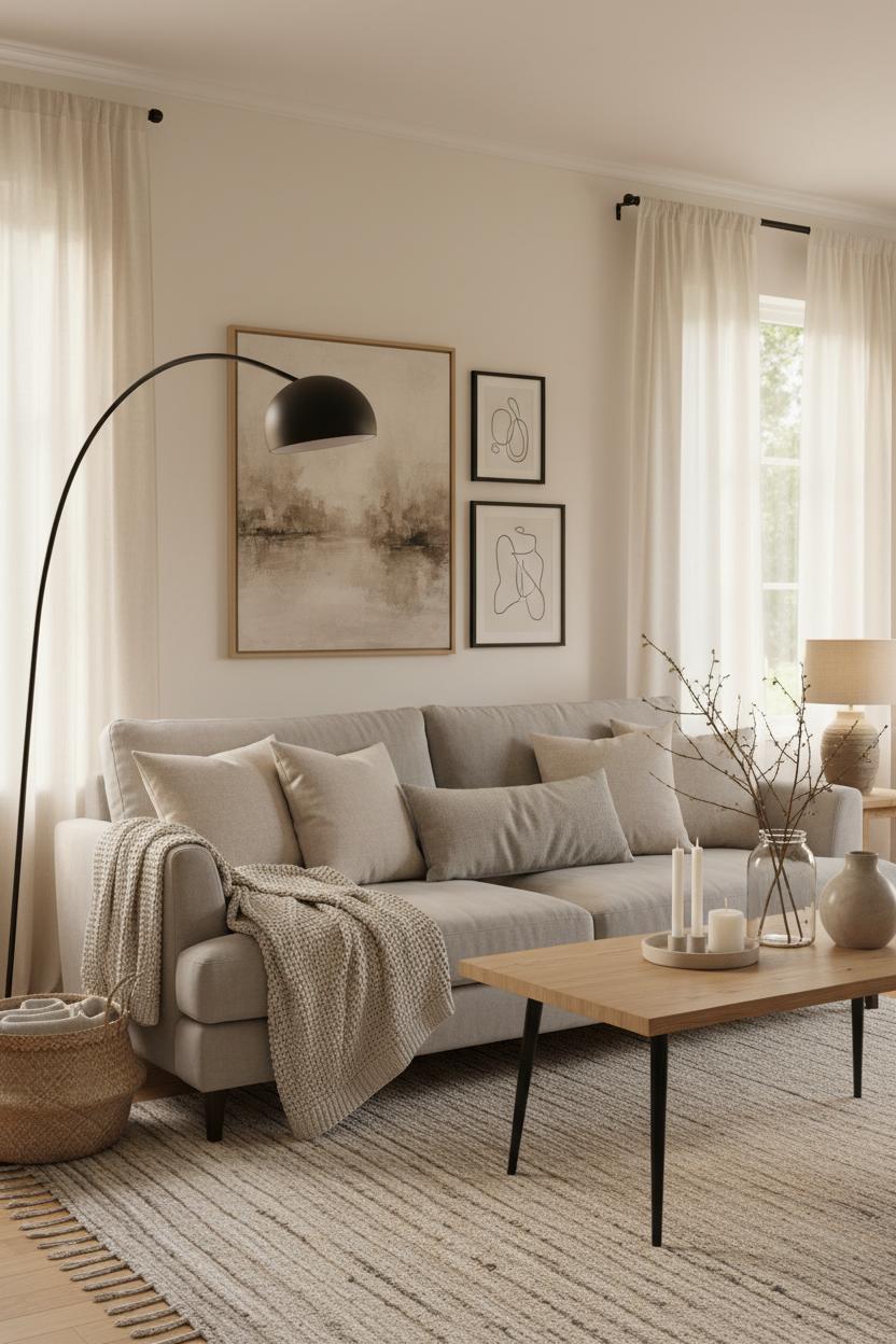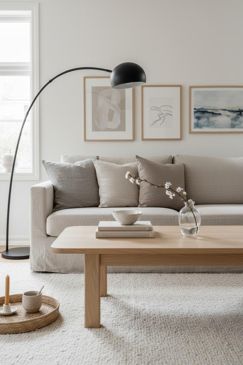 Clutter is the enemy of calm, but emptiness isn’t the goal. Embrace the quieter side of Scandinavian decor by styling fewer, better pieces, each chosen for comfort and meaning. A low basket beside the sofa corrals throws, a slim console hides everyday bits, and a single branch in a ceramic vase brings the outdoors in without visual noise. On the walls, opt for neutral wall art—tonal landscapes, abstract lines, or monochrome prints—that whispers instead of shouts and ties the room together without stealing the show. If you crave contrast, introduce it gently: a charcoal knit throw, matte black frames, or the graceful curve of that black arc floor lamp can ground the space while keeping the vibe light. Finally, let your routines guide your layout: a sunlit spot for morning coffee, a soft corner for evening reads, a clear sightline to keep the room breathing. When each element earns its place, your Scandinavian-inspired sanctuary feels intentional, cozy, and beautifully quiet—proof that a minimalist living room can still be wonderfully warm.