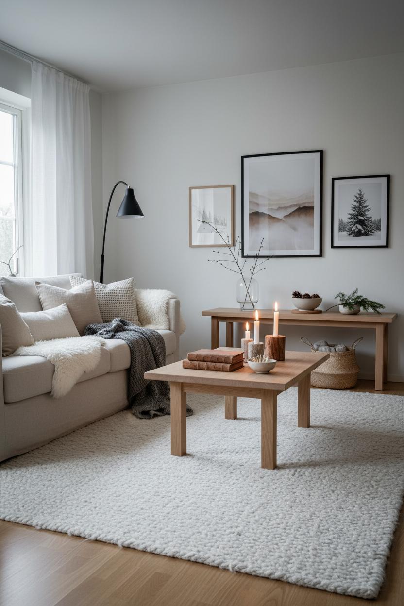 Edit gently rather than overhaul. Tuck remotes and odds and ends into woven baskets, corral smaller objects on trays, and rotate in just a few winter-forward pieces so your space stays calm and breathable. Play with layers of white, ecru, and mushroom, then ground them with charcoal or matte black accents so the room feels quietly defined. The beauty of Scandinavian decor in winter is its restraint—nothing fussy, everything tactile and intentional—so each addition should earn its place by adding warmth, function, or a little seasonal charm. With a few thoughtful swaps, your living room stays minimal, light, and wonderfully comfortable all winter long.
