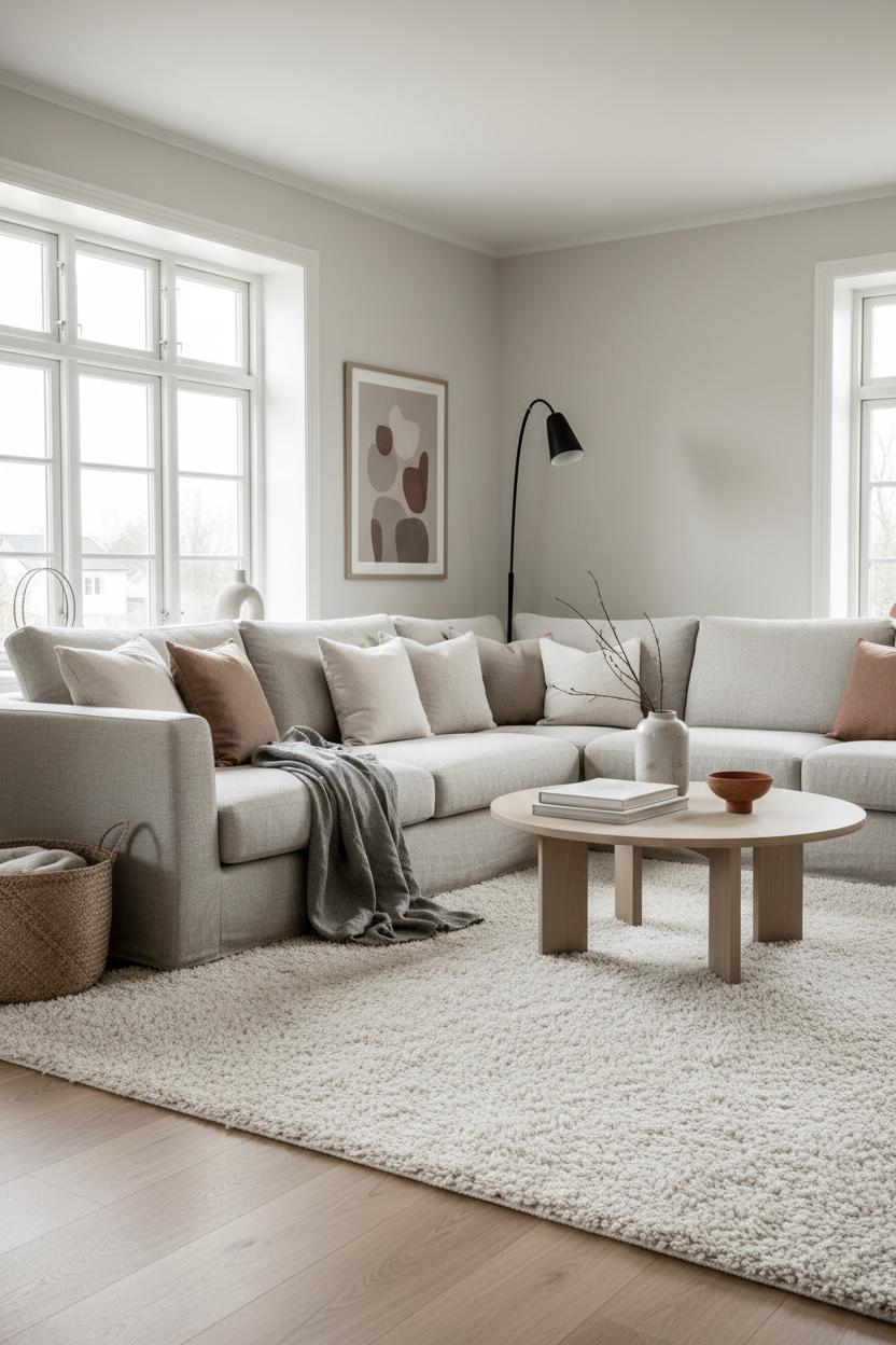 Texture is where the coziness blooms. A plush wool area rug underfoot adds instant quiet and comfort, visually anchoring your seating while inviting slow mornings. Toss in a linen throw pillow set for a different weave and weight—crumpled in the best way—and keep the palette tonal so the eye can rest. For contrast that still suits a minimalist living room, a black arc floor lamp introduces a sculptural curve and a hint of graphic definition, like eyeliner for the space. On the walls, choose neutral wall art with organic forms or soft landscapes; it whispers rather than shouts, tying back to the rooted, hygge style vibe. A few branches in a stoneware vase, a stack of well-loved books, and plenty of negative space keep things airy and intentional. The goal isn’t to fill every corner, but to let each piece breathe—so you feel it, not just see it. With natural materials and earthy tones leading the way, your Scandinavian decor becomes more than a look; it becomes a mood, a daily ritual of quiet that makes home feel like a gentle retreat.