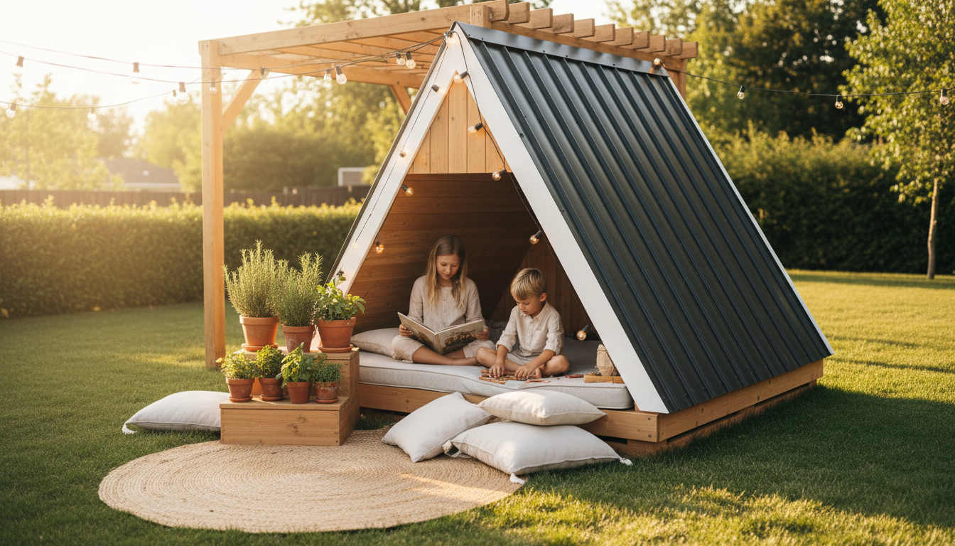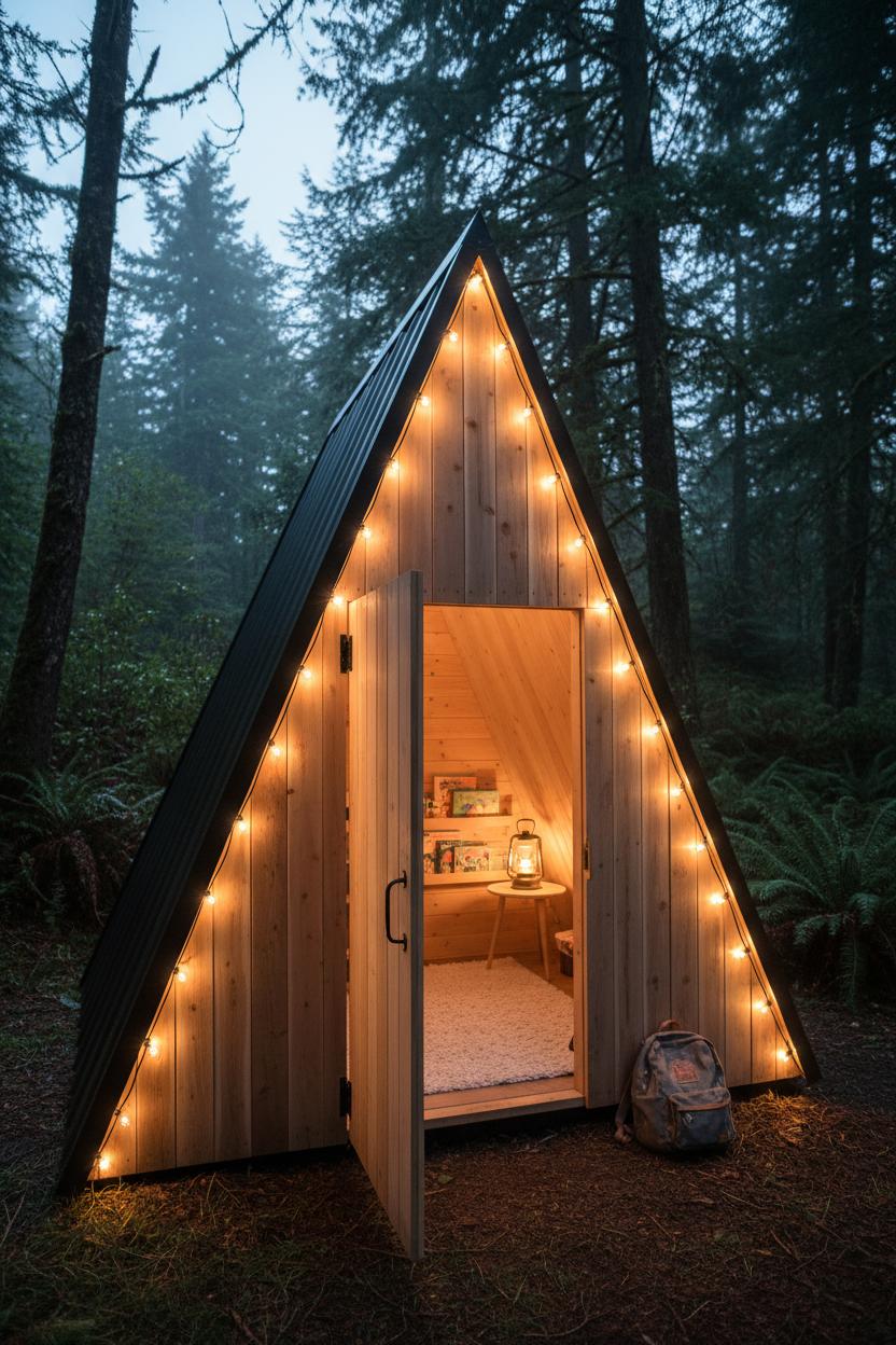 In Oregon, Emma and Ro lined their structure in vertical cedar and left it raw to silver over time—a true cedar playhouse moment that smells like a forest every time you slide the door. They layered in a wool rug, a low book ledge, and a battery candle lantern for rainy-day reading. For evening magic, they draped outdoor string lights along the ridge beam, so the A-line becomes a soft triangle of sparkle after sunset. Over in North Carolina, Sam’s crew leaned into the idea of a kids outdoor playhouse that doubles as a garden studio: crisp white exterior, wood-batten trim, and a skinny potting shelf outside the window for herbs. Inside, a peg rail corrals dress-up capes, and a tiny enamel hook holds a watering can—practical and charming in equal measure.