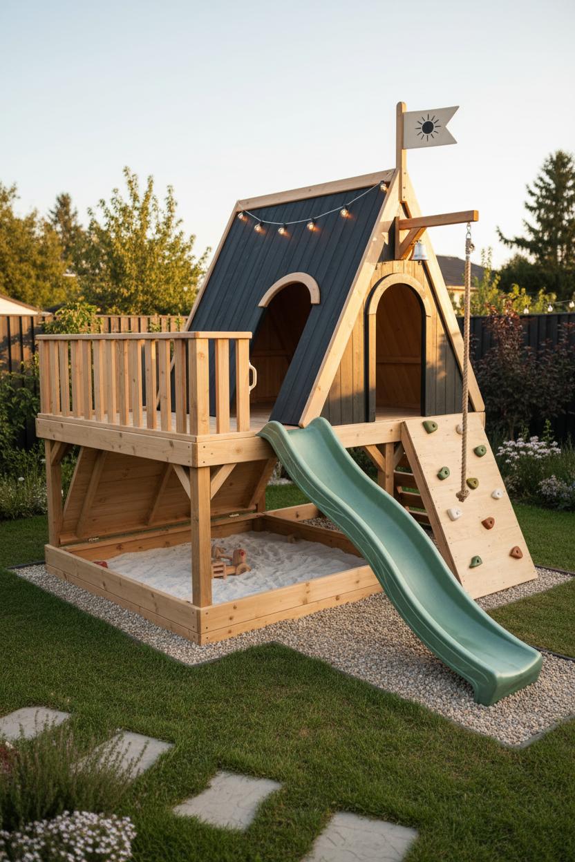 Ready to turn your A-frame playhouse into a mini adventure park? Think of the slide, sandbox, and climbing wall as the “smart upgrades” that make your backyard kids playhouse feel custom and considered—like the chic, Scandinavian playhouse version of a treehouse. If you’re mapping things out from scratch, your DIY playhouse plans should reserve one gable for a playhouse slide. Choose a slide style that matches your deck height and follow the manufacturer’s specs for safe angles and attachment. We cut a gentle arch in the railing with a jigsaw, sanded the edges buttery smooth, and mounted the slide with exterior-grade hardware so little feet can swoop down safely. If you’re starting with an A-frame playhouse kit or a prebuilt kids outdoor playhouse, the slide often bolts on with predrilled holes—just add a grip-friendly handrail and a soft landing zone of mulch or pea gravel to keep everything cozy and calm.