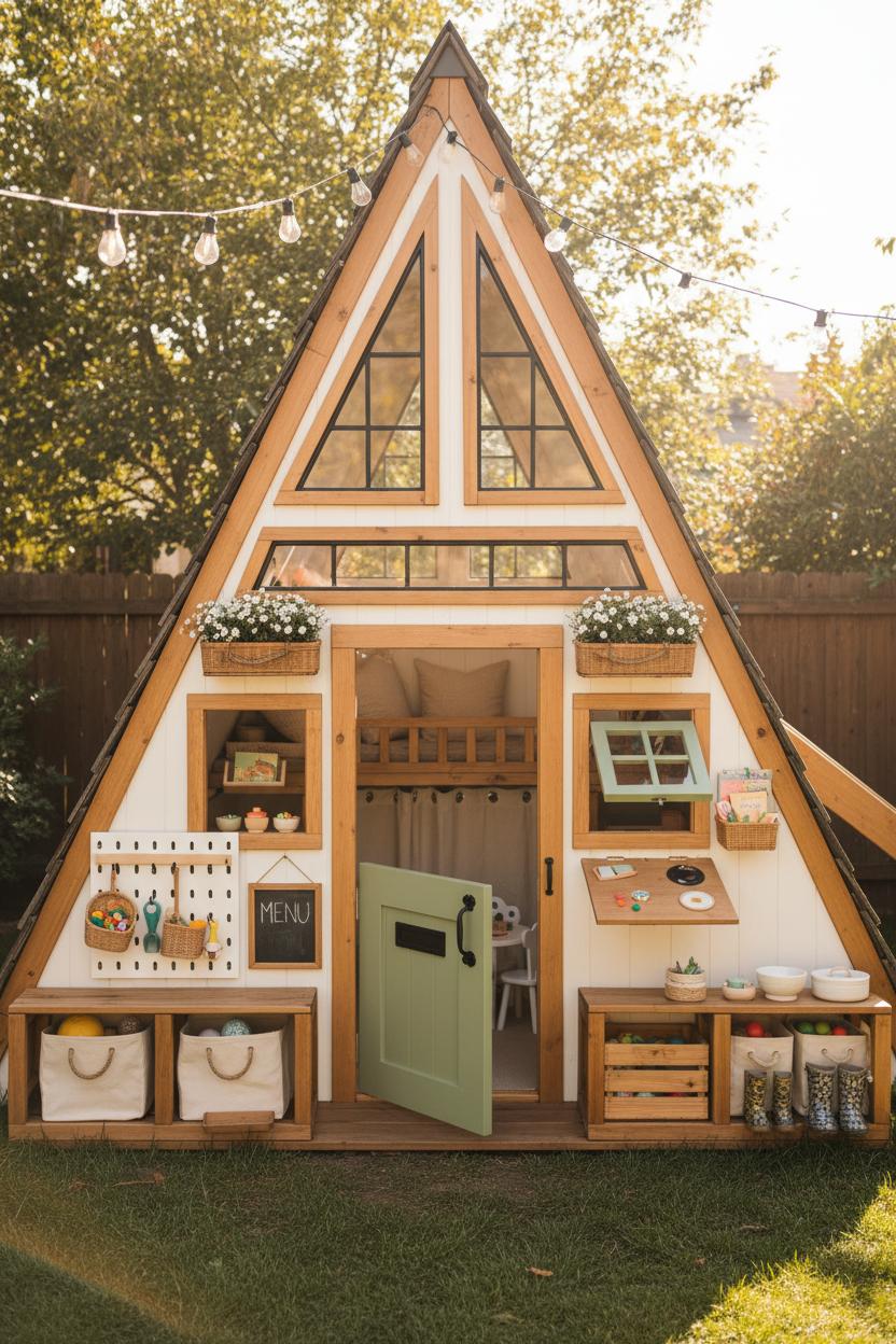 Storage magic happens when you use every angle. Those steep sides of a backyard kids playhouse are perfect for low, lidded benches that double as seats; hinge them with soft-close hardware and tuck blocks, books, and art caddies inside. Shallow shelves between the rafters corral tiny treasures without crowding the footprint, and a skinny wall of pegboard holds baskets, play food, or garden tools at kid height. Under a loft or reading perch, slide in rolling crates; along the narrow gable end, build a fold-down desk that flips up to hide craft chaos. If you add a playhouse slide, claim the space beneath for ball bins or rain-boot cubbies. Curtain off a “mud-kitchen” corner with washable linen and stash mixing bowls behind it—instant tidy. For longevity, cedar playhouse components resist weather and smell amazing, and simple oil keeps that honey tone glowing. These wooden playhouse ideas are all about function in disguise: labeled rope-handled totes, stair treads with secret drawers, and a slim shoe trough by the door. Whether you’re customizing from scratch or upgrading a kit, the right windows, a friendly door, and smart tucked-away storage make your A-frame playhouse feel calm, purposeful, and so easy to keep cute.