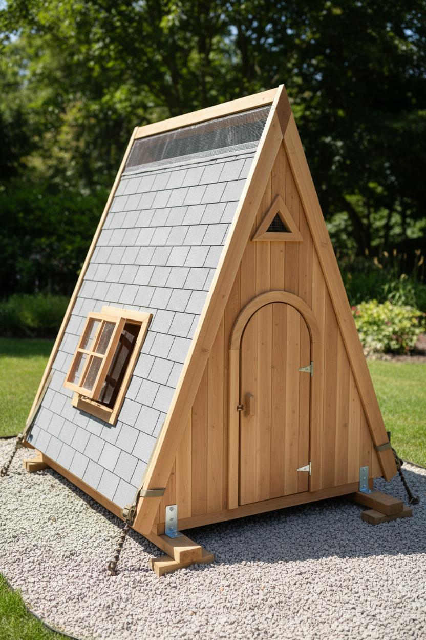 Ventilation is the quiet hero of a happy kids outdoor playhouse—fresh air keeps it cool, prevents mustiness, and protects finishes. Think cross-breeze: one operable window opposite the door, with small gable or eave vents high up to let heat escape. The A shape is perfect for a discreet ridge vent; leave a narrow gap at the peak beneath the cap and back it with insect screen. Use child-safe window latches and soft-close hinges so little fingers don’t get pinched. Light colors and a matte exterior on the roof help reflect heat, especially if your wooden playhouse ideas lean sun-drenched and minimal like true Nordic style.