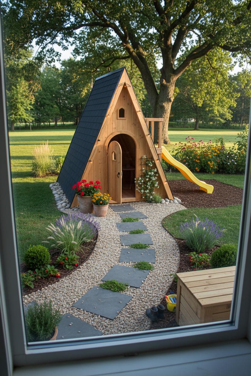Start by choosing a spot where your A-frame playhouse feels tucked in yet easy to keep an eye on—ideally within view of the kitchen window and kissed by morning light. Look for gentle shade from a tree or add a simple sail so the interior stays cool, and check drainage after a rainstorm so little feet aren’t splashing in puddles. A level pea gravel or decomposed granite pad with a crisp metal or timber edge instantly frames the footprint and keeps mud at bay. If you’re working from DIY playhouse plans or opting for an A-frame playhouse kit, orient the roofline to break the wind and open the doorway toward the prettiest sightline. For a clean, Scandinavian playhouse vibe, pair pale gravel with charcoal stepping stones and soft green plantings; it’s minimal, modern, and makes the structure feel like it’s always been part of the yard.