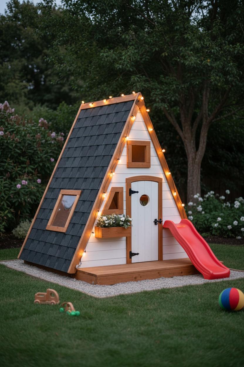 There’s a reason the A-frame playhouse keeps popping up in your saved pins: that crisp triangle silhouette is equal parts modern and storybook, instantly elevating your yard without feeling bulky or dated. An A-frame playhouse tucks neatly into a corner, but its soaring pitch gives big style in a small footprint—like a tiny cabin that’s both cozy and architectural. It reads effortlessly high-end next to native grasses, gravel, or a simple paver patio, and the clean lines play well with everything from mid-century to cottage-core. Inside, the open peak creates an airy, light-washed volume that feels magical to kids and photogenic for you. Whether it becomes a rainy-day reading nook, a summer lemonade stand, or a twinkly-night retreat, a backyard kids playhouse shaped like an A-frame feels intentional—more boutique bungalow than toy shed.