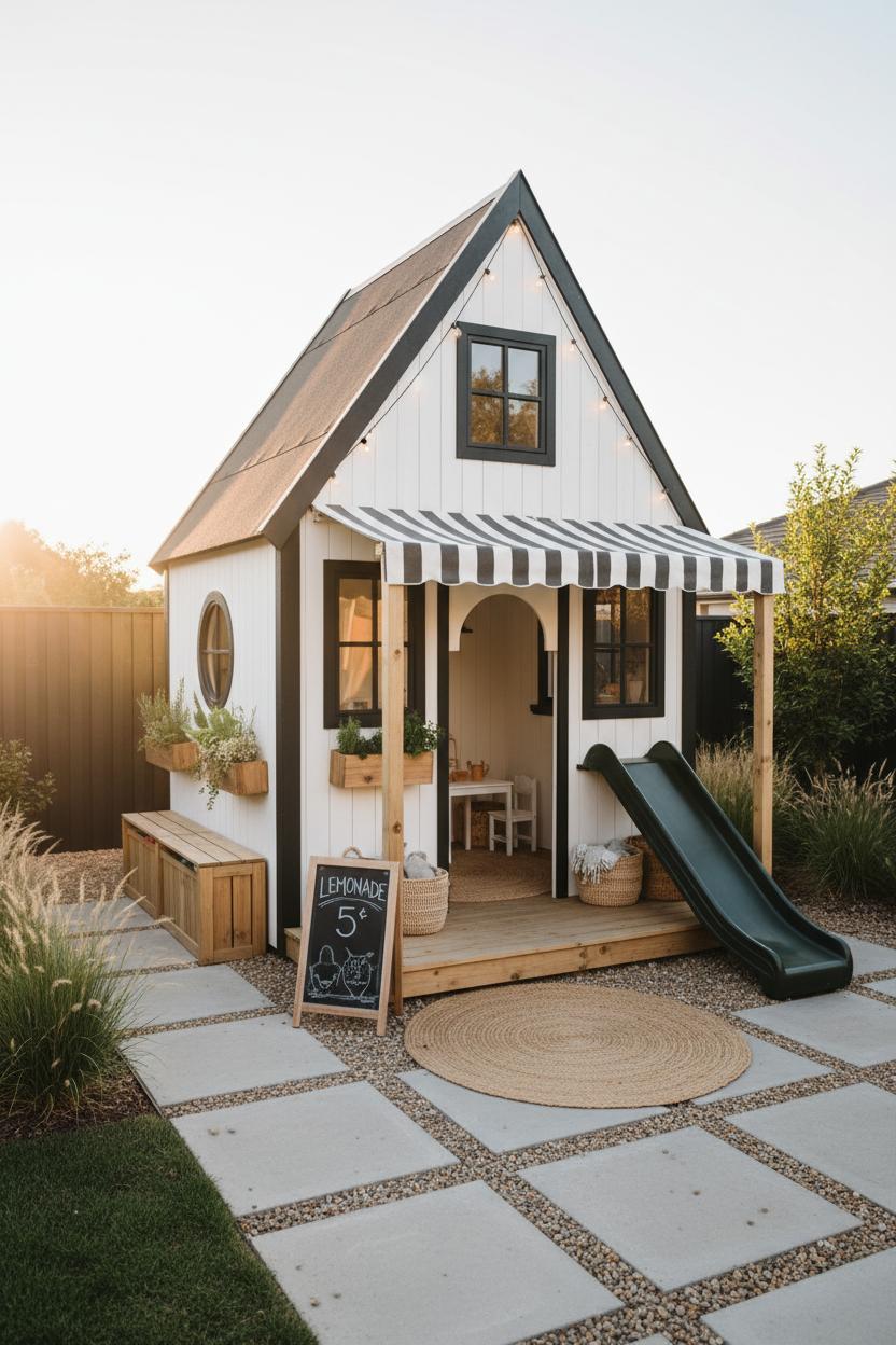 Which upgrades give the most joy per dollar? A playhouse slide is the instant hero—pair it with a safe landing zone and you’ve created a tiny playground. Clip-on planter boxes, a chalkboard menu, and a little mail slot breathe life into everyday play. Cozy rugs, a battery tea light “fireplace,” and outdoor string lights add that magical glow after dusk. For wooden playhouse ideas that stay chic, try natural wood tones, black hardware, and linen stripes—simple layers that flatter an A-frame silhouette.