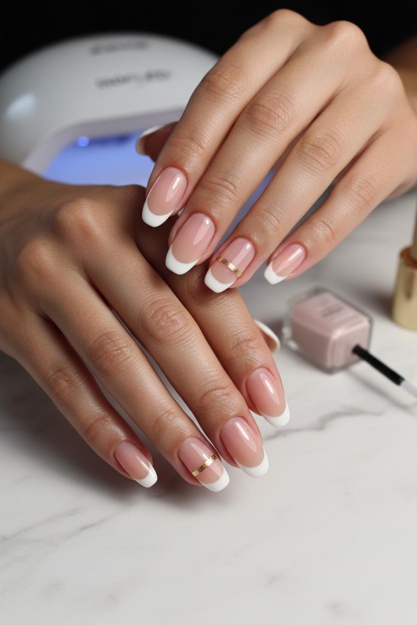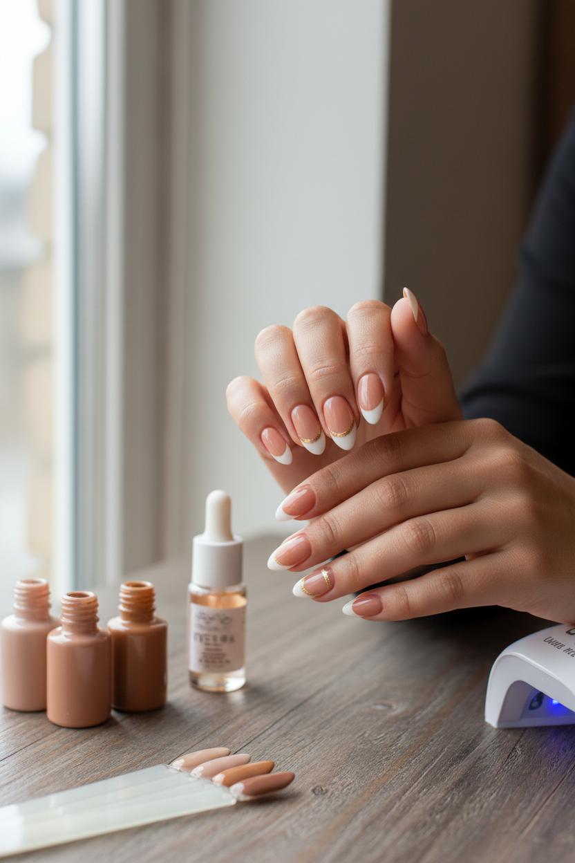 Once your sheer base is smooth and your tips are sketched in, it’s all about that flawless finish under a UV LED nail lamp. Work in thin, even layers of nude gel polish so the light can penetrate fully; thick coats can wrinkle or stay gummy. I like to flash-cure the nude for 10–15 seconds first, then refine the smile line of the french tip nails, and give a full 60-second cure. If you used guides from a french manicure kit, peel them off slowly before the final cure so the line stays crisp. Always cap the free edge with each layer—base, color, and top—to lock in shine and prevent chips. If you’re adding the daintiest metallic accent, a whisper-thin stripe of gold nail tape placed just beneath the tip looks luxe, and it seals beautifully once you float a top coat over it and cure.
