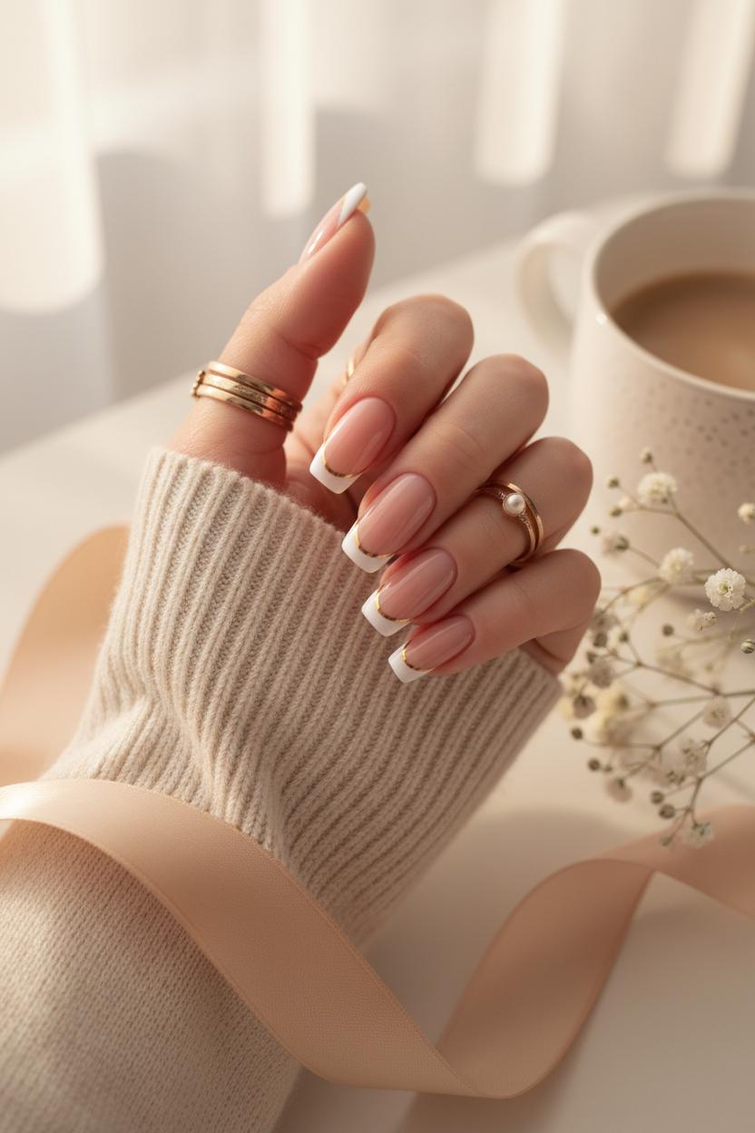 Style your scene with simple textures that whisper luxury. A cream knit sleeve, a linen napkin, or a satin ribbon in champagne will echo the warmth of nude gel polish and make those french tip nails pop. Try a delicate ring stack, a coffee cup, or a flower stem for scale and mood; if you’re planning wedding nails, a bit of lace or a tiny bouquet brings instant bridal romance. Keep tones cohesive—beige, blush, soft gold—so all eyes stay on your elegant nails. If you added a slim line of gold nail tape along the smile line or as a minimalist accent, tilt your hand to catch the light and let that metallic thread flicker without stealing the scene.