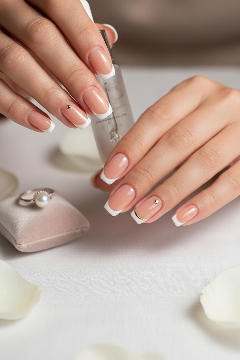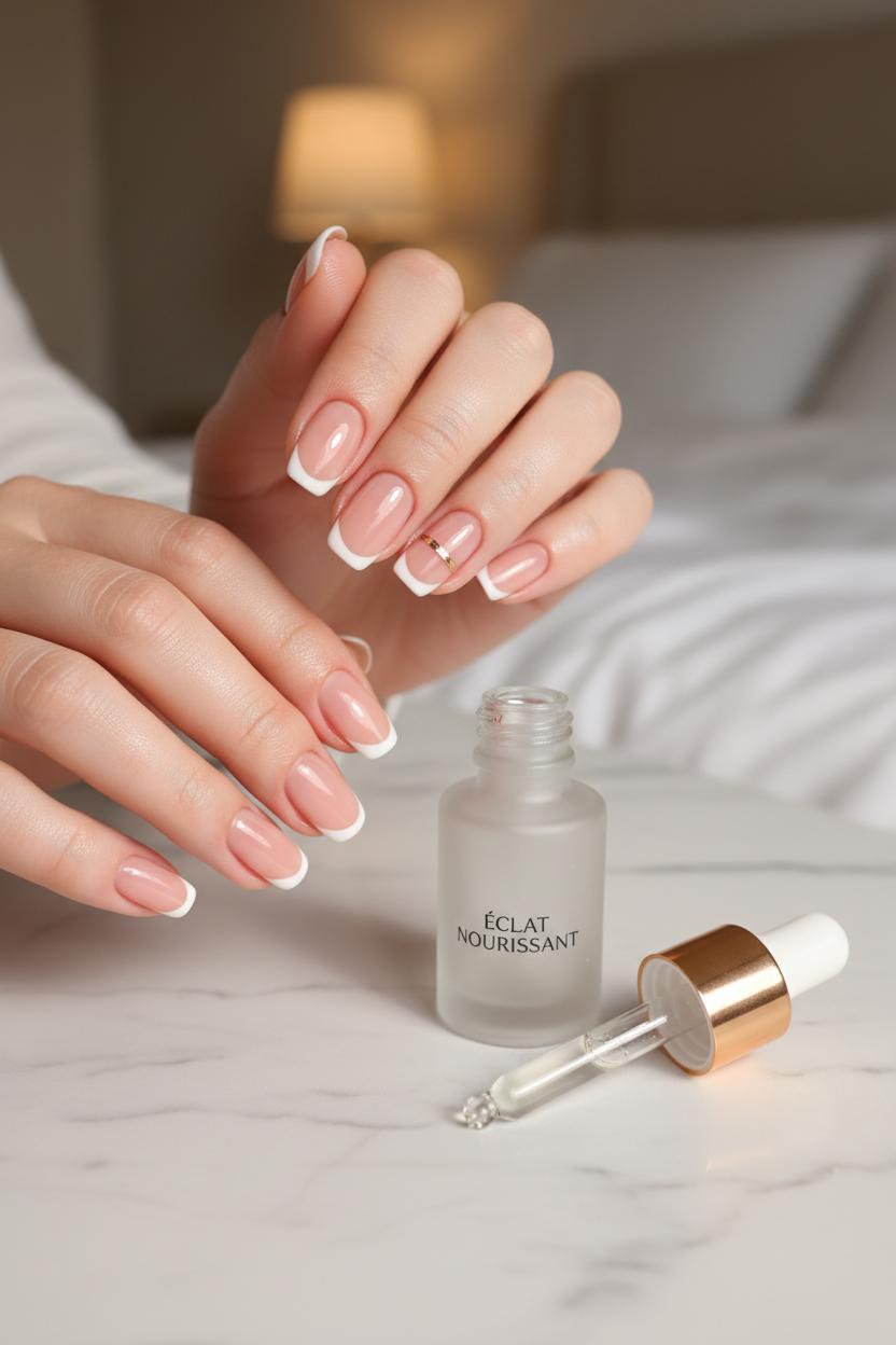 Once your soft nude French tips are set and shining, the secret to keeping them picture-perfect is simple: daily cuticle oil. Think of it as a tiny ritual with big payoff—morning after hand cream or right before bed, trace a whisper of oil along the cuticle line, then gently massage it in to encourage circulation and lock in moisture. This one-minute moment keeps the skin silky, prevents hangnails, and helps your nude manicure look fresher longer by minimizing dryness that can lead to micro-lifts around the edges. I like to keep a mini bottle in my bag and add a drop after using sanitizer or washing dishes; the hydration brings instant life back to elegant nails and makes those soft glam nails gleam in a subtle, healthy way. If you’re curating wedding nails or prepping for an event, start the nightly oil habit a week in advance and you’ll notice your french tip nails stay smooth, glossy, and camera-ready.