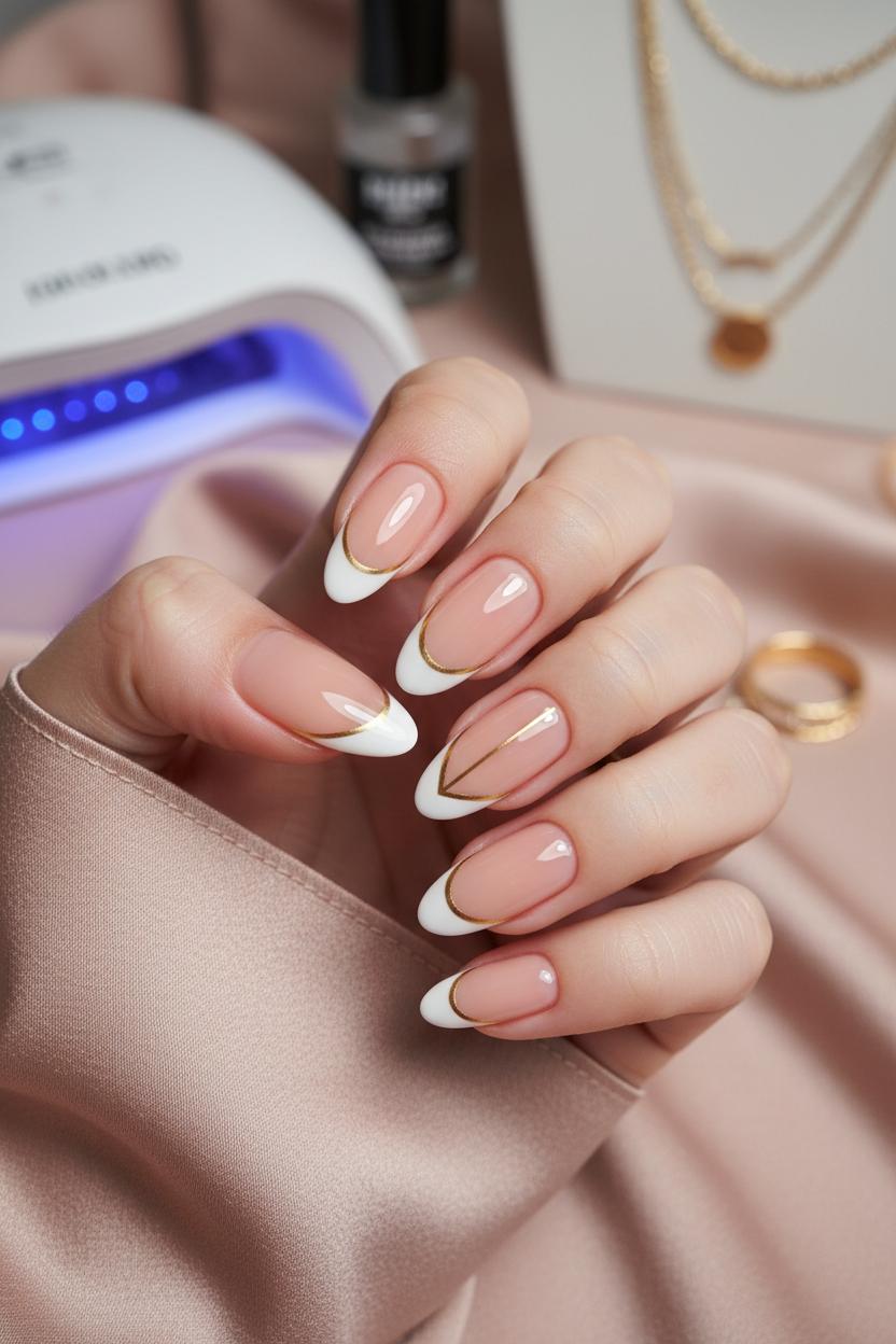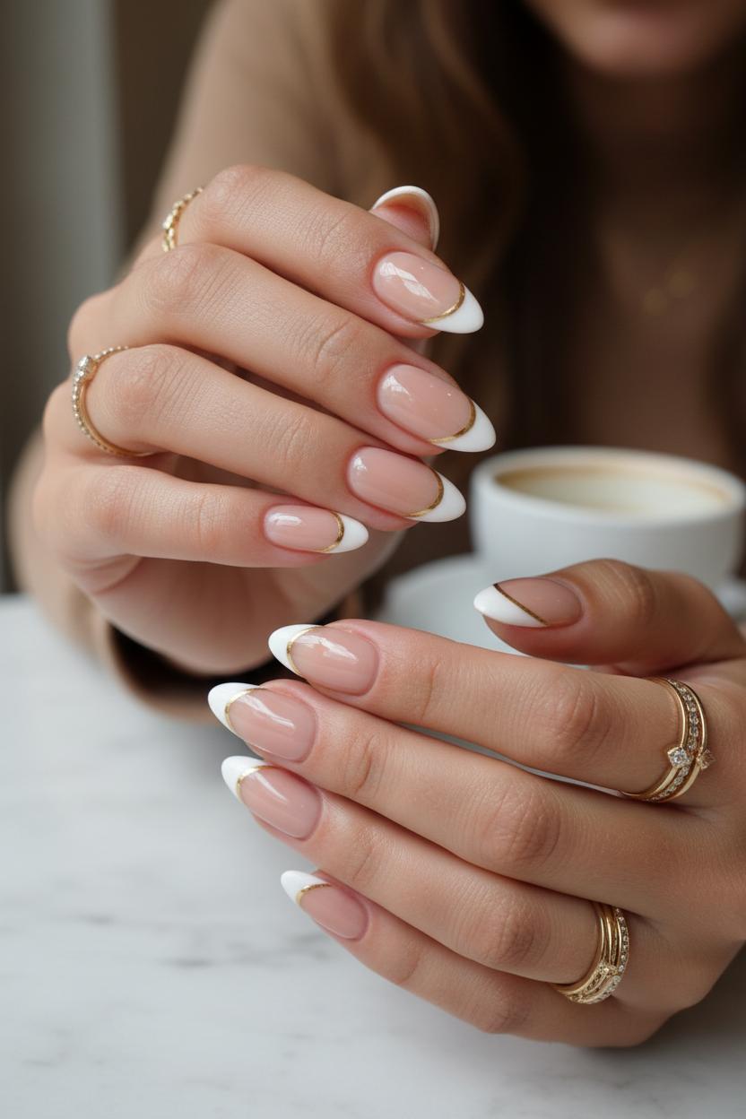 If you’re feeling a touch bolder, try a single vertical strip on just one accent nail, or a delicate V at the tip for a contemporary chevron moment. Even the subtlest placement reads like thoughtful design, keeping the overall effect refined—perfect for wedding nails when you want elegant nails that won’t compete with your dress. The gold plays so well with warm nudes and blushy beiges, softening the metallic while still adding light. Finish with a second layer of top coat to lock the tape’s edges and prevent lifting, then pamper everything with cuticle oil so the skin looks as glossy as the polish. The result is a modern, minimalist take on french tip nails that feels timeless and fresh all at once: clean lines, a creamy nude manicure, and a gleam of gold that catches the eye only when the light hits—like the chicest secret.