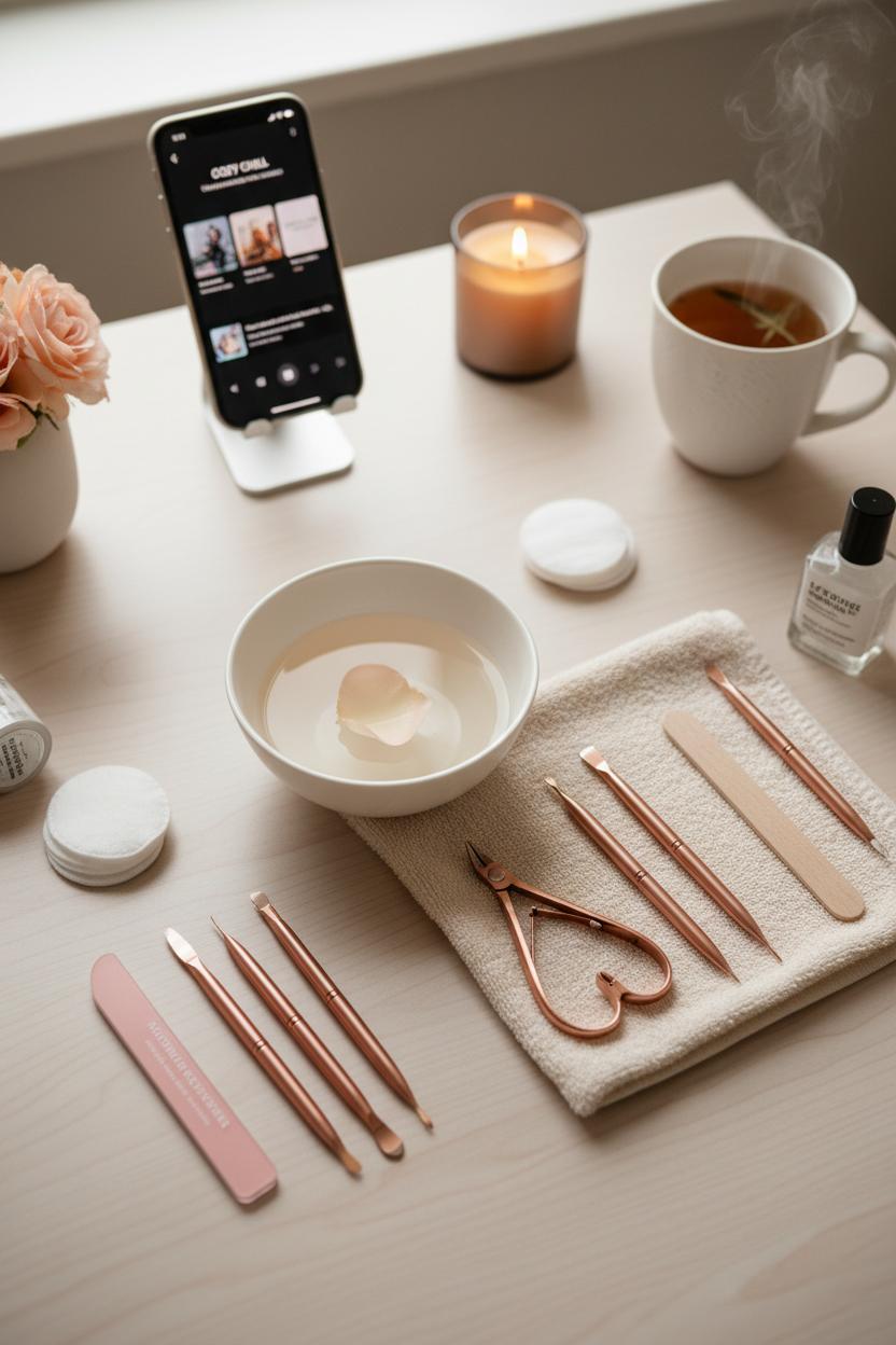 Before you snap that first photo, set the stage with a little hand TLC—your camera catches everything. Massage in cuticle oil for an instant, healthy sheen and hydrate knuckles so skin looks plush, not parched. If you’ve just finished your nude manicure, wipe away any polish haze and tidy edges so the lines are crisp; a soft cloth buff on the nails removes dust that can read as specks in close-ups. Natural light is your best friend for soft glam nails: stand near a bright window and turn your hand until the tips glow without glare. If the sun is harsh, sheer curtains or a white napkin over the window will diffuse it into that dreamy, candlelit gleam Pinterest loves.