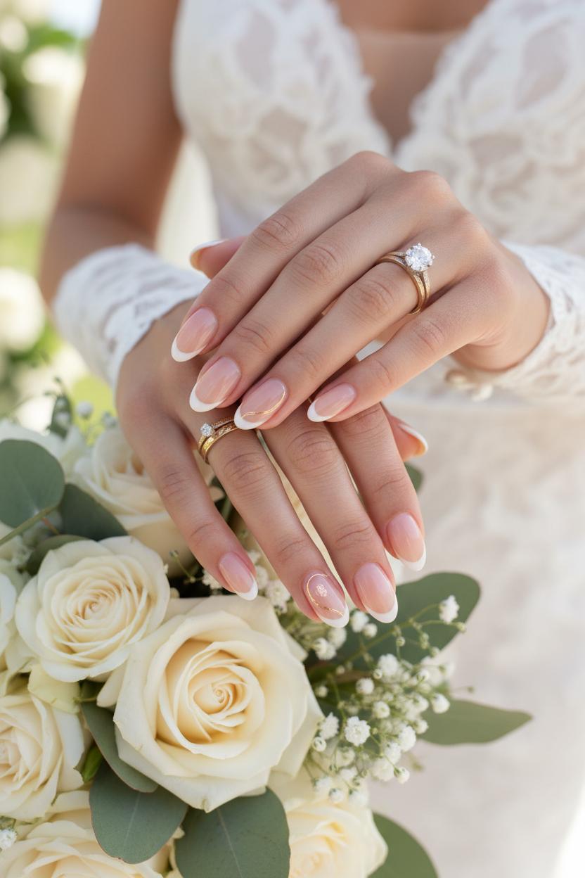 For the bride who dreams of elegant nails that whisper rather than shout, a nude manicure with French tips is the definition of timeless romance. Think of it as soft-focus beauty for your hands: a sheer blush or milky nude base that melts into a clean, whisper-thin tip, catching the light the way silk does as you move. This look flatters every dress style—from minimalist slip gowns to lace-laden ball gowns—because the palette is neutral, polished, and impossibly refined. Keep the tips slender and slightly rounded on almond or squoval shapes for that soft glam nails energy, and consider a warm ivory or off-white tip instead of stark white to keep everything bridal but modern. The result is the kind of wedding nails that elevate your ring shots, bouquet holds, and cake-cutting candids without competing for attention.