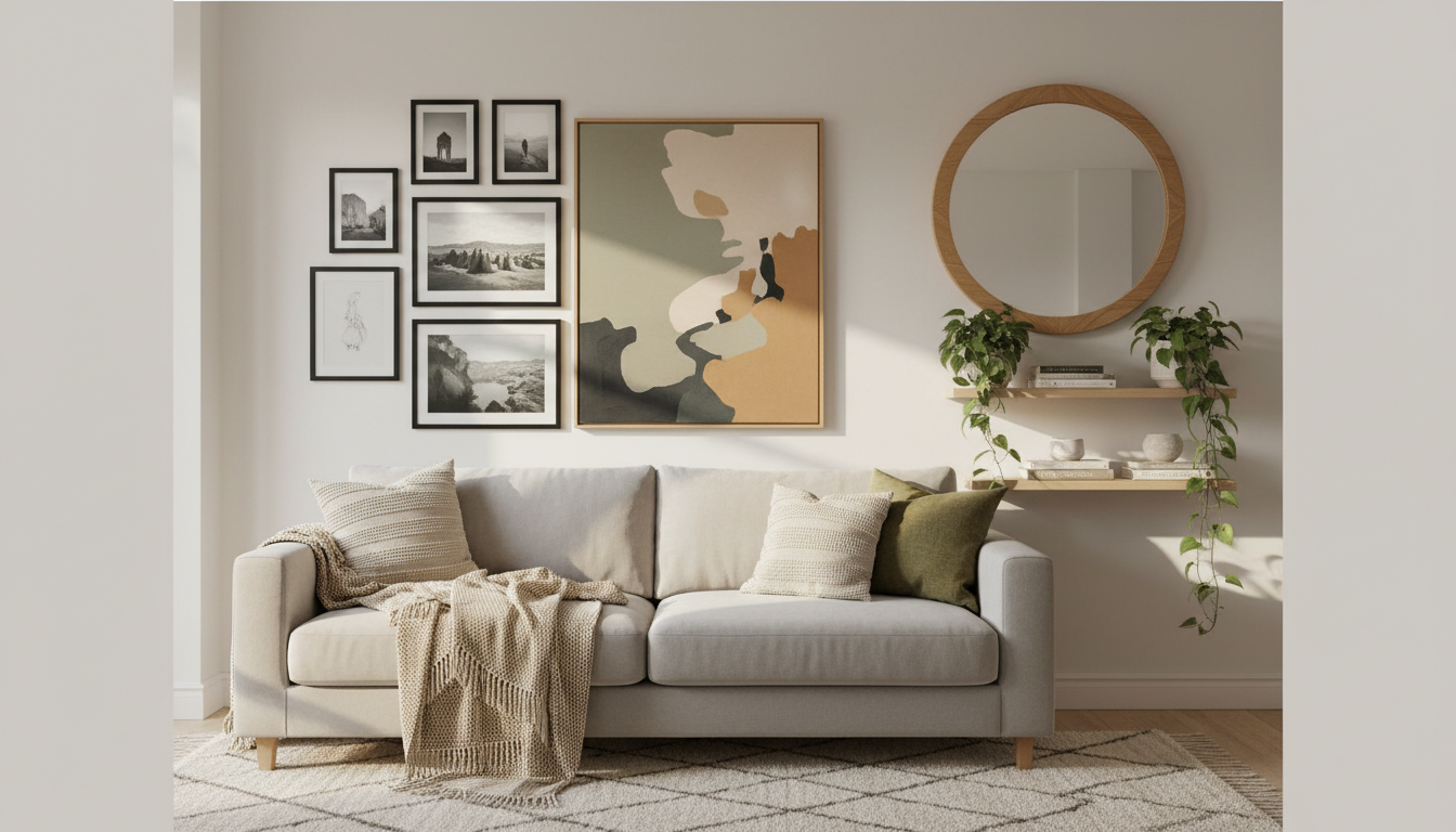 Asymmetry, on the other hand, is where personality and movement show up. Start with an anchor—maybe modern wall art that’s slightly off-center—and build out with smaller pieces so the whole composition forms a loose triangle. Mix in a round wall mirror to break up square edges, or stagger floating shelves along one side and style them with stacked books, plants, and ceramics for layered floating shelves decor that feels collected, not crowded. Try gallery wall ideas that blend sizes and shapes: a petite sketch next to a statement canvas, a woven wall basket, and a petite photo in a brass frame. Keep balance by echoing color or material—black frames that repeat, a touch of brass in three spots, wood tones that reappear—so the eye can connect the dots even if nothing “matches.”