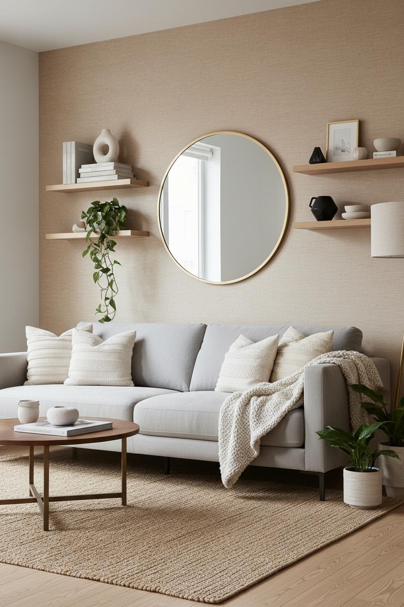 When square footage is tight, a round wall mirror is pure magic for living room wall decor. Its soft shape breaks up all the straight lines in a small space, bounces light like a second window, and instantly makes the room feel airier. Hang a medium-to-large piece above a console or sofa, centered and just a touch higher than eye level so it captures natural light. Choose a slim metal frame in matte black, brass, or champagne for a modern wall art vibe that still feels timeless. If your walls need a little extra pop, lay down a panel of peel and stick wallpaper behind the mirror—think linen texture, subtle stripes, or a micro-gingham—to create a gentle backdrop that reads custom without a big commitment. The result is that high/low balance we all love: mirrors for living room areas that look designer, set against a textural moment that’s easy to swap.