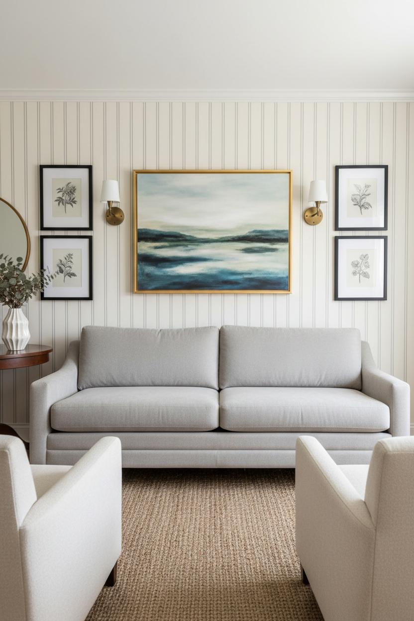 When you’re playing with symmetry in your living room wall decor, think calm, classic, and collected. Symmetrical layouts feel instantly polished because the eye knows where to land: center a piece of large wall art over the sofa, flank it with a matching picture frame set or a pair of sconces, and let everything mirror itself from left to right. A round wall mirror above a console, balanced by twin vases or lamps, is another foolproof formula—mirrors for living room layouts bounce light and make the whole space feel taller and brighter. If your backdrop is bold (hello, peel and stick wallpaper in a stripe or subtle print), symmetry helps keep the look refined. Matching frames, consistent mats, and equal spacing create that tailored, hotel-lobby elegance without feeling stiff.