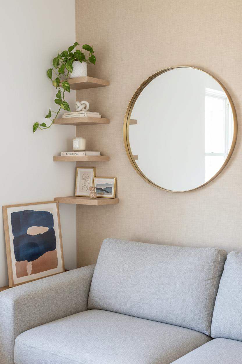 To the side of the mirror, add two or three ultra-slim floating shelves to build a vertical vignette that functions like art. Keep them narrow so they tuck in neatly and don’t crowd the walkway; the magic is in curated floating shelves decor, not bulk. Layer a small trailing plant, a stack of petite books, and a candle with a couple of leaning prints from a coordinated picture frame set for an instant mini gallery. Mix in one unexpected object—a ceramic knot, a tiny sculpture, a seashell from your last getaway—to bring personality. If your wall can handle it, anchor the arrangement with one piece of large wall art opposite the mirror, then let the floating shelves bridge the gap; it’s one of my favorite gallery wall ideas for balancing scale while keeping the room feeling open. Stick to a tight palette that echoes your textiles—two neutrals plus one accent color—so the styling feels effortless and cohesive.