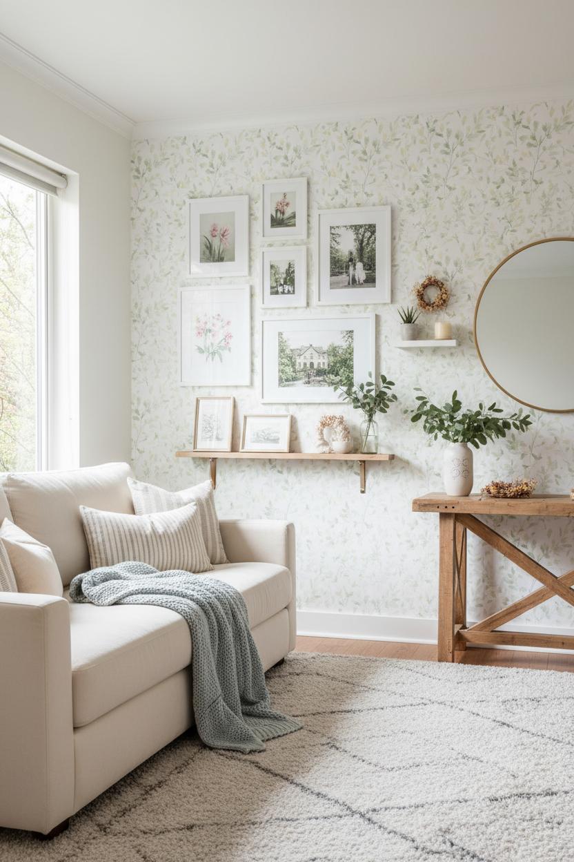 Don’t forget the glow factor: mirrors for living room spaces are the ultimate seasonal multitaskers. A round wall mirror over the mantel or console bounces late-afternoon light in winter and amplifies airy vibes in summer, plus it plays beautifully with patterned walls. Flank it with slim floating shelves to create a softly symmetrical moment you can tweak with candles, mini wreaths, or fresh greenery as the months change. The beauty of this switch-up strategy is that nothing is precious—your wallpaper peels off, your frames refill, your shelves restyle—so your walls can evolve right along with your mood, your playlist, and the season outside your window.