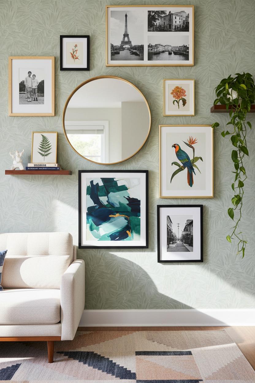 To style it out, try a simple foundation wall in plaster-white, or line one accent wall with a subtle peel and stick wallpaper in a woven or grasscloth look to deepen the texture. Then layer in floating shelves for dimension—keep the floating shelves decor clean with a few ceramics, a trailing plant, and a picture frame set in mixed finishes (oak, black metal, and brushed brass) so it feels intentional, not busy. This is where gallery wall ideas can really shine: intersperse modern wall art prints with a sculptural metal piece, a small wooden cutting board repurposed as art, and a couple of petite mirrors for living room sparkle. If you’re nervous about mixing, repeat each material at least twice—two wood frames, two metal accents, two canvases—so the composition feels balanced. Finish with a soft lamp glow hitting the edges of frames, and let negative space do some of the styling for you. The best part? With a few well-chosen pieces—think floating shelves, a round wall mirror, and one strong canvas—you’ll get that high-design, collected look that makes your walls feel styled today and timeless tomorrow.