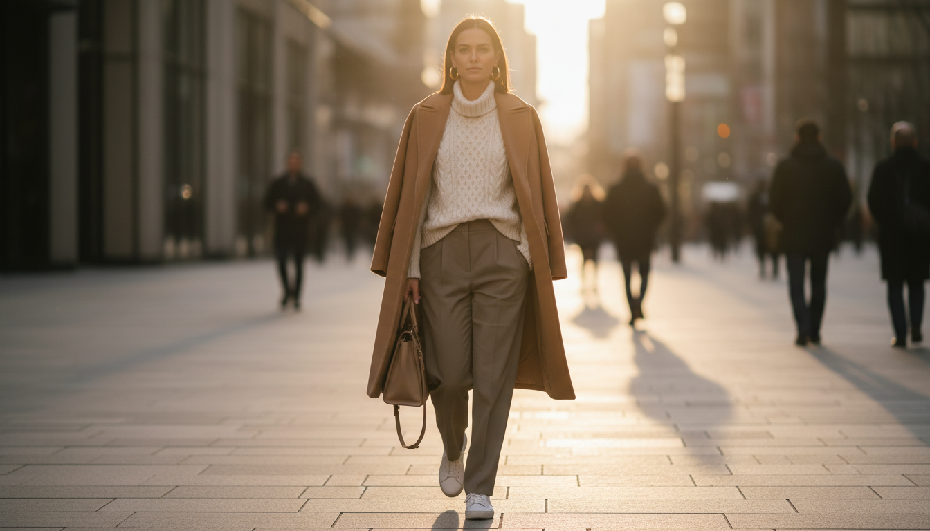 Start with the all-star combo: a camel coat women reach for year after year, a plush cream turtleneck sweater, and charcoal tailored trousers women can dress up or down. It’s polished enough for the office, yet comfortable for a long brunch. Add white sneakers women swear by for a modern, effortless finish, or swap for sleek ankle boots if you want more structure. A pair of gold hoop earrings instantly adds warmth against those cool charcoals and creamy knits, and a structured tote keeps everything elevated. If coats feel too heavy early in the season, trade the outer layer for a soft camel blazer and belt it for shape—same palette, lighter feel.