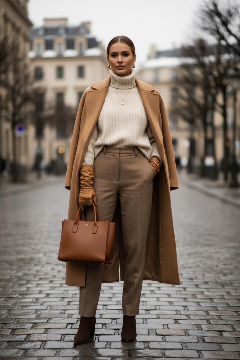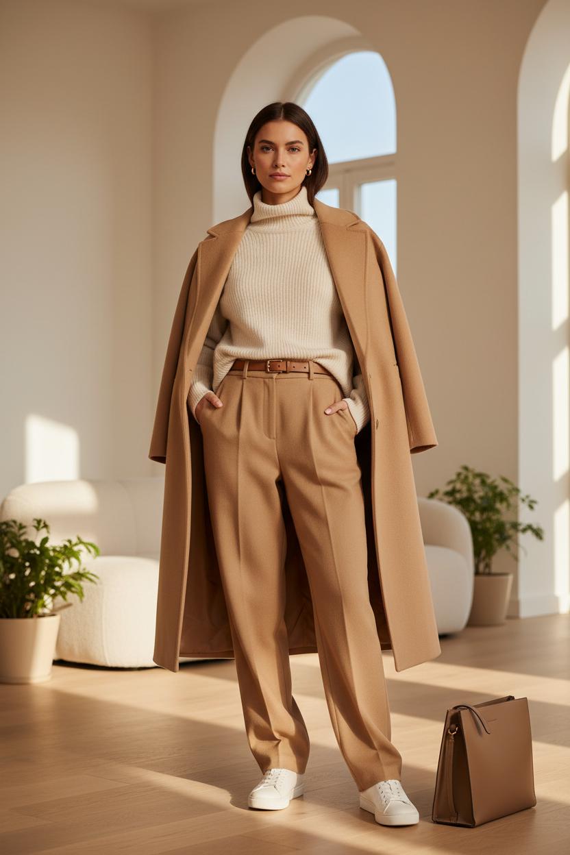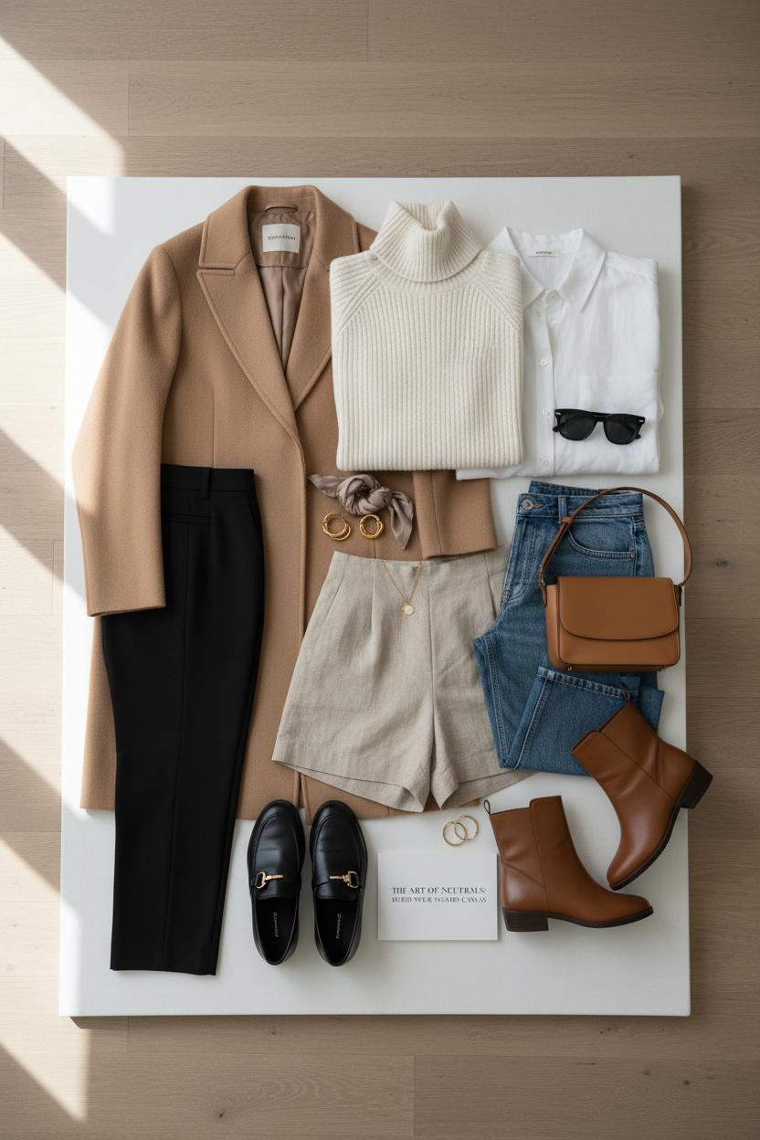 For fall outfit ideas, lean into cozy proportions: drape that camel coat over the cream turtleneck sweater, pull on tailored trousers women love in a warm mushroom tone, and ground everything with loafers or those clean white sneakers. When winter bites, add a cashmere scarf and switch to chunky boots; in spring, trade the coat for a light trench and roll your sleeves; in summer, pair an airy linen button-down with beige shorts and minimal sandals, keeping the gold hoop earrings for a little sparkle. Rotate fabrics with the weather, but let the color story hold steady. With a few thoughtfully chosen pieces and a commitment to warm neutrals, your closet becomes a quiet, beautiful backbone for every day—proof that chic, neutral outfits really do work all year.