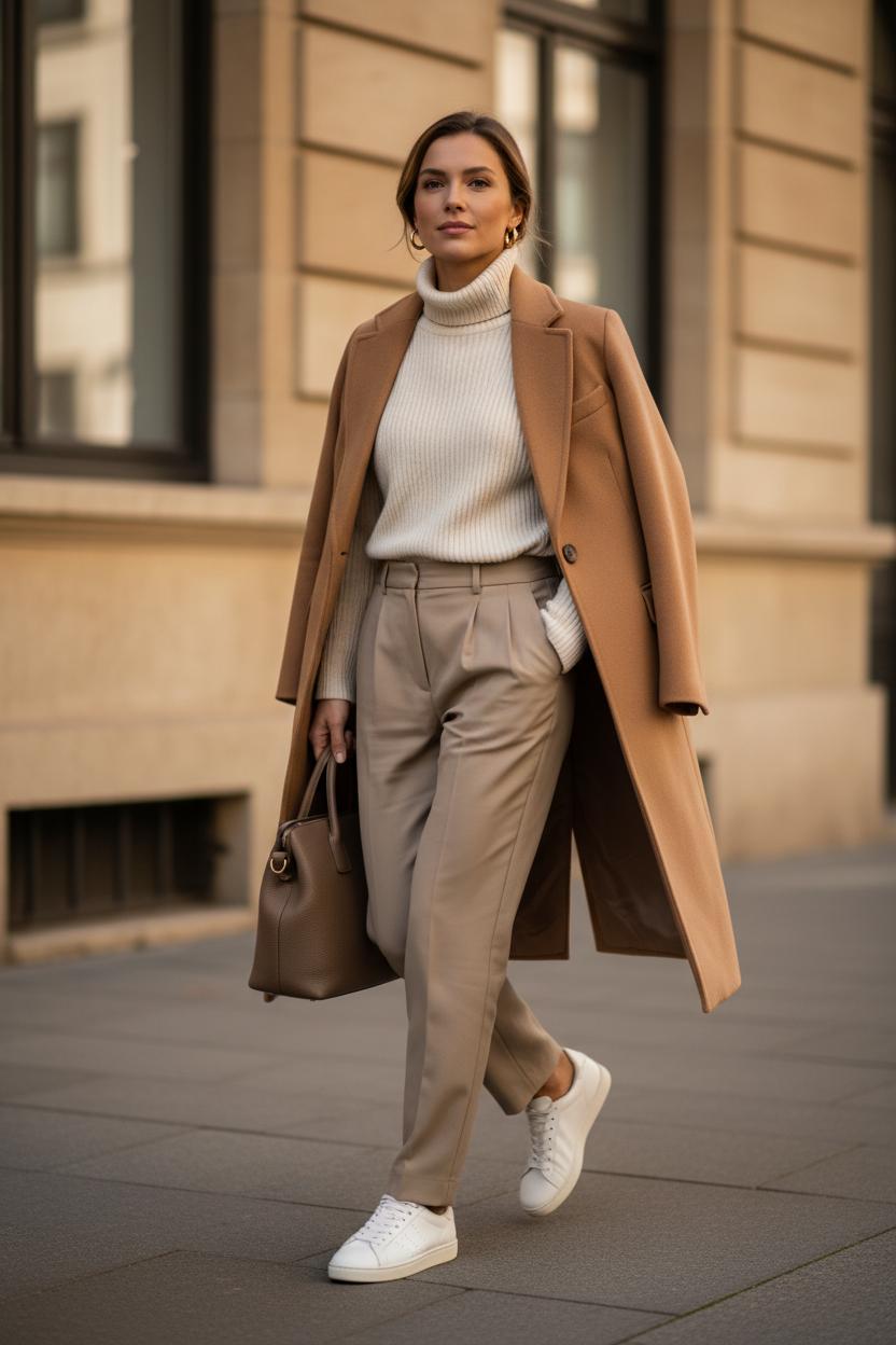 Formula 1: Cream knit + tailored bottoms + clean sneakers. Start with a cream turtleneck sweater and tuck it into tailored trousers women in a soft taupe or charcoal. Add white sneakers women for that crisp, off-duty polish and finish with delicate gold hoop earrings. In winter, slip a camel coat women over top and you’ve got a cozy, elevated take on minimalist style; in spring, swap the coat for a lightweight trench and push up the sleeves. This is one of those neutral outfits that always photographs beautifully—calm, tonal, and endlessly remixable within a capsule wardrobe. Think coffee runs, casual Fridays, museum dates; just adjust the shoe to a loafer or heeled boot when you want to sharpen the lines.
