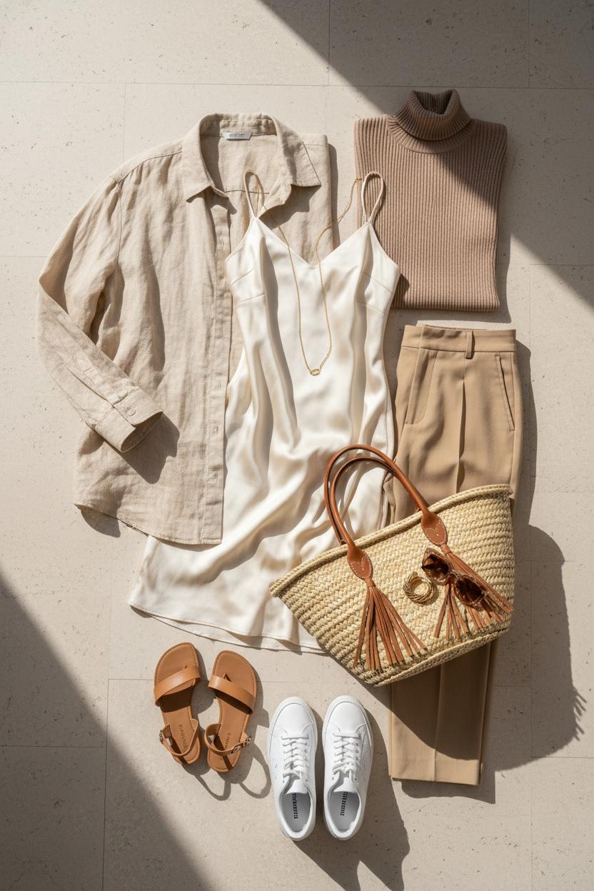 For a summer capsule wardrobe, start with a relaxed linen shirt, a slip dress in a soft mushroom or cream, and tailored trousers women can wear from desk to dinner in lightweight twill. Add strappy sandals for daytime and swap in white sneakers women love for a clean, modern finish; both ground the look without competing with your neutrals. I always reach for gold hoop earrings to add a hint of glow against sun-kissed skin, and I’ll sling a lightweight cream turtleneck sweater over my shoulders for evening breezes or overzealous office AC—it doubles as a styling piece and a layer. If you prefer structure, try a linen vest and trouser set or a barely-there blazer; keeping silhouettes simple lets the fabrics breathe and the tones do the talking. Belt a shirt over a slip, cuff your hems, and let a peek of ankle keep everything light.