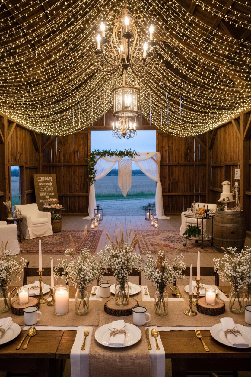 There’s something magical about stepping into a barn and imagining it transformed into a chic, glow-y party—like a secret garden with a country soul. Start with lighting to set the tone: drape string lights warm white from beam to beam, layer in a few lanterns and maybe a statement chandelier, and you’ll have that romantic sparkle that flatters every photo. Keep your palette soft and cohesive—creamy whites, warm woods, and a touch of metallic shine—and build from there. On tabletops, a burlap table runner instantly adds texture; top it with mason jar centerpieces filled with baby’s breath artificial flowers, wild grasses, or even dried blooms for fuss-free elegance. Mix clear glass with raw wood and a hint of brass to balance rustic charm with refined polish—exactly the vibe for a boho country wedding.