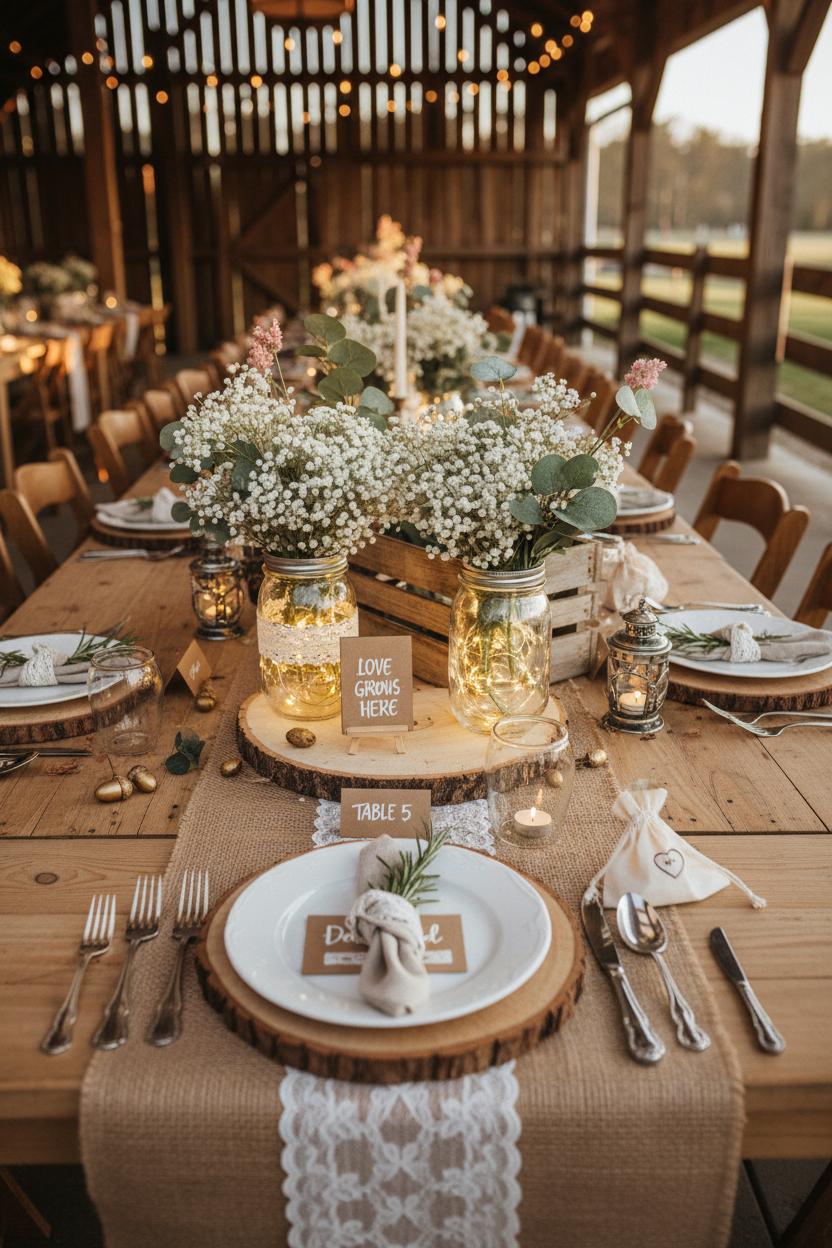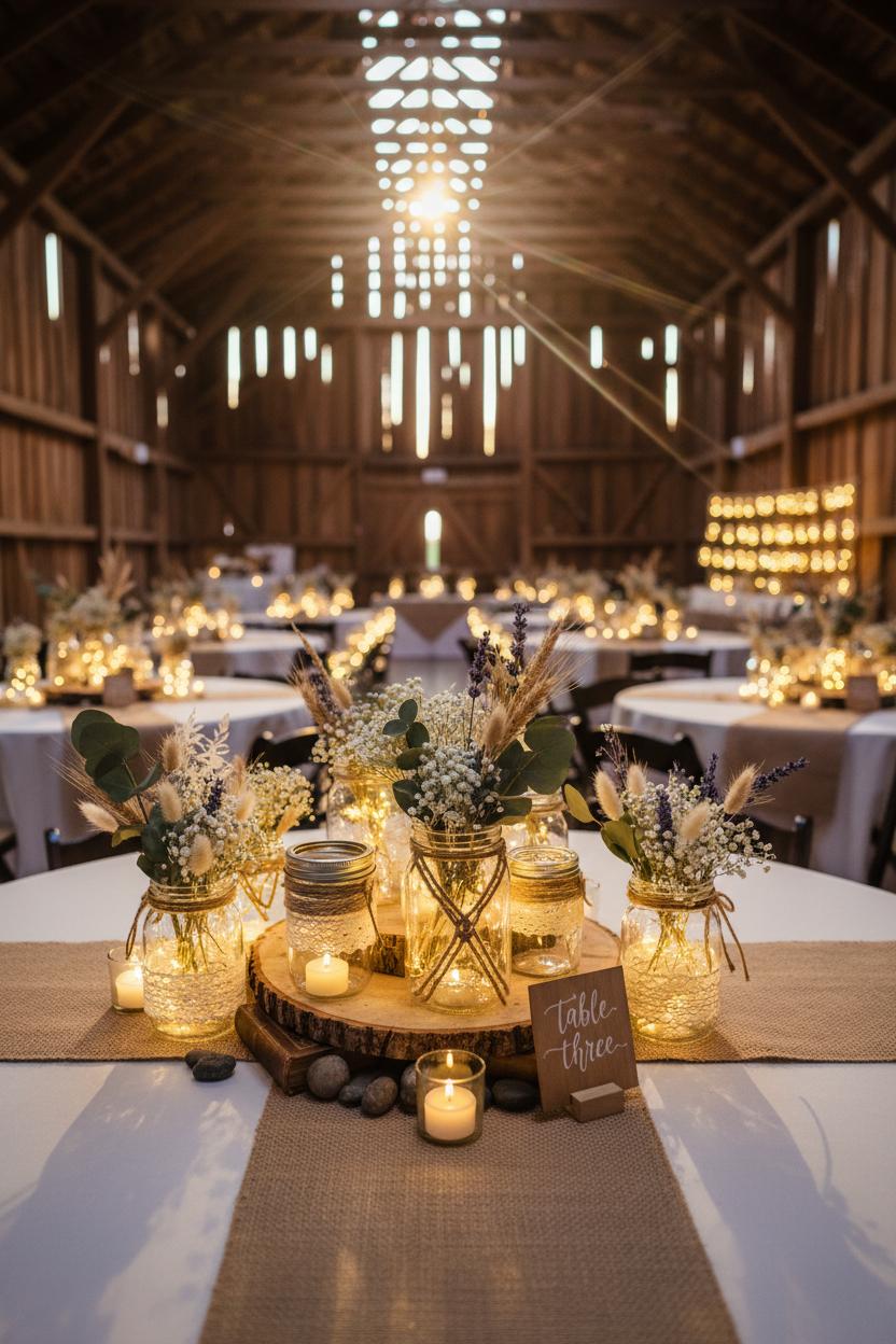 Picture this: guests walking into your reception as twilight slips through the rafters, and every table glows like a little constellation. That’s the magic of mason jar centerpieces—simple, affordable, and endlessly customizable for rustic wedding ideas that still feel elevated. Start by grounding each table with a burlap table runner, then cluster a few jars in varied heights on a slice of reclaimed wood or a vintage book. Wrap the jars with twine or a ribbon of lace, add a sprig of greenery, and fill them with string lights warm white, tucking the battery pack beneath the runner for a clean look. For soft texture, tuck in baby’s breath artificial flowers; they’ll keep their shape all day and you won’t stress about wilting. A few jars can hold dried wheat, lavender, or eucalyptus for fragrance and movement, while others can showcase floating candles or tea lights for that layered glow. The result is cozy, romantic barn wedding decor that photographs beautifully and looks just as dreamy in person.