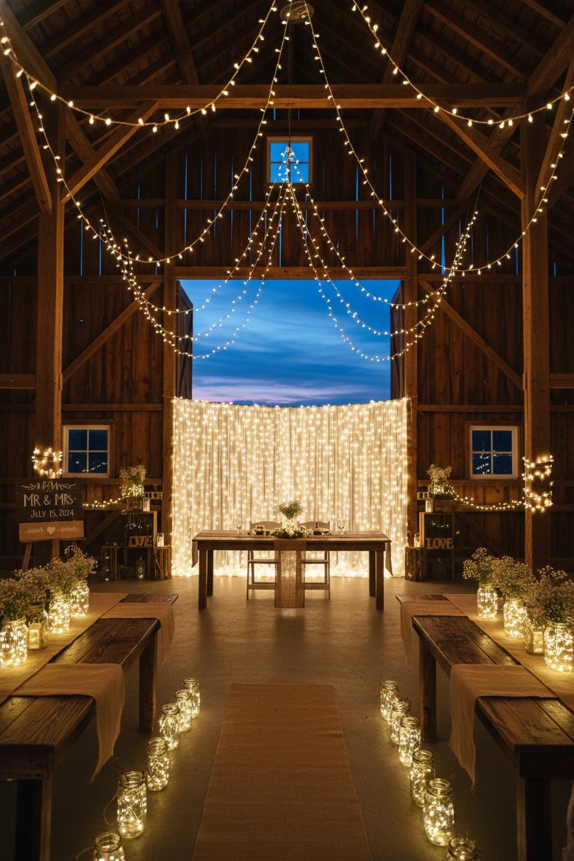 As the sun slips behind the fields and that dusky blue settles over the siding, this is where the magic begins: flip on string lights warm white and watch your barn glow like a storybook. There’s something about that soft, buttery twinkle against weathered wood that makes everything feel instantly intimate and photogenic. Draped from rafters in loose swoops, tucked along beams, and cascading behind the sweetheart table, they turn simple barn wedding decor into a golden, starry canopy. If you’re dreaming of boho country wedding vibes, let the light do the heavy lifting—warm white strands flatter skin tones, blur the edges of the night, and make even the most pared-back setups feel luxe and layered. Picture the shimmer glancing off mason jar centerpieces and catching on the frayed edges of a burlap table runner, while wooden wedding signs glow softly at the entry and along the bar. It’s the easiest of rustic wedding ideas with the biggest payoff: romance you can hang in an hour.