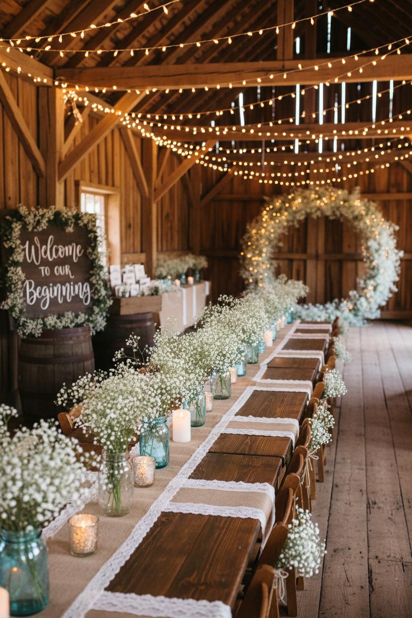 Styling tip: build layers of texture so the blooms don’t feel too one-note. Tuck sprays into mason jar centerpieces and line them up on a burlap table runner with a little lace for contrast. Add strands of string lights warm white overhead, letting the glow catch the tiny petals like stars scattered across the tables. Use a few stems to soften wooden wedding signs at the entry, tie petite bundles to chair backs with twine, or weave them through a ceremony arch for a romantic haze that reads beautifully in photos. Artificial sprigs are perfect for cake table garlands, escort card displays, and welcome barrels, and they can be repurposed later for your home or shower decor. For fresh stems, keep arrangements loose and airy, give them room to breathe, and cluster them in different heights of jars for that collected look. However you combine them, baby’s breath is the ultimate multitasker in rustic wedding ideas—sweet, simple, and endlessly photogenic.