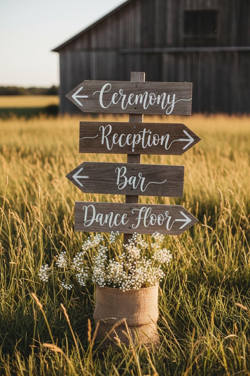 Wooden wedding signs are the secret storytellers of a rustic celebration—practical and pretty, with that hand-touched charm that makes guests feel instantly welcome. Start with directional signs that gently guide everyone from parking to “I do,” the bar, and the dance floor. Think reclaimed boards with hand-lettered arrows, stained in warm honey or left weathered for that boho country wedding vibe. Keep your fonts consistent so the signs feel cohesive with the rest of your barn wedding decor, and echo those details on your table numbers or favor tags. If you love DIY wedding decorations, try stencils and a paint pen, then seal with a matte finish so they’re photo-ready. Nestle directional stakes among wild grasses, wrap bases with a burlap table runner remnant, and add sprigs of baby’s breath artificial flowers for a soft, airy touch.