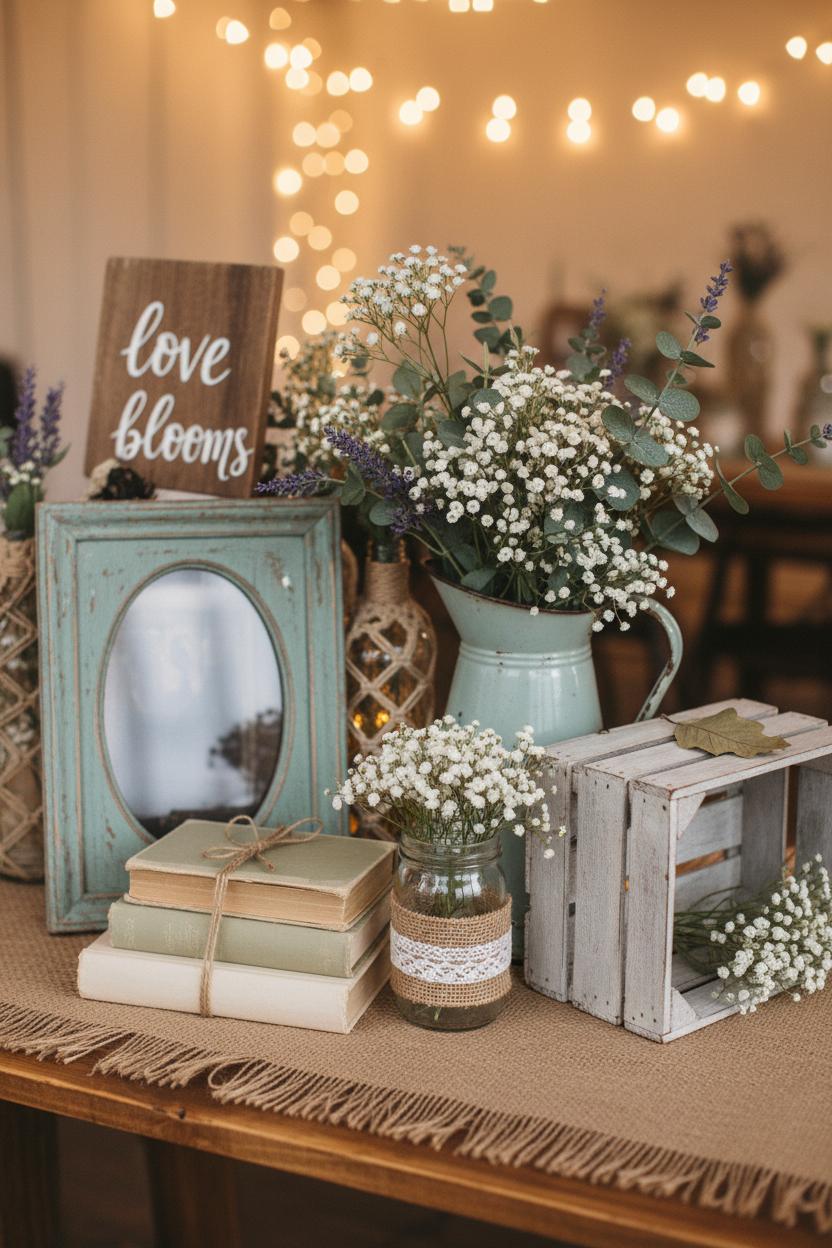 If your heart leans rustic but your wallet wants to keep it practical, start with a thrift-store treasure hunt. Barn wedding decor comes alive with pieces that already have a little history—chippy frames, vintage books, sun-bleached crates, and old enamel pitchers turn simple greens and blooms into storybook moments. Gather simple glass jars and turn them into mason jar centerpieces with twine, lace scraps, and a few stems of baby’s breath artificial flowers; line them up on a burlap table runner to instantly warm up long farmhouse tables. Mix in thrifted candlesticks and secondhand brass for that layered glow. This is the sweet spot for rustic wedding ideas: meaningful, collected, and delightfully imperfect. For the aisle, reuse those jars on shepherd hooks, then move them to the reception. Let your finds guide your palette and create that effortless boho country wedding vibe without splurging.