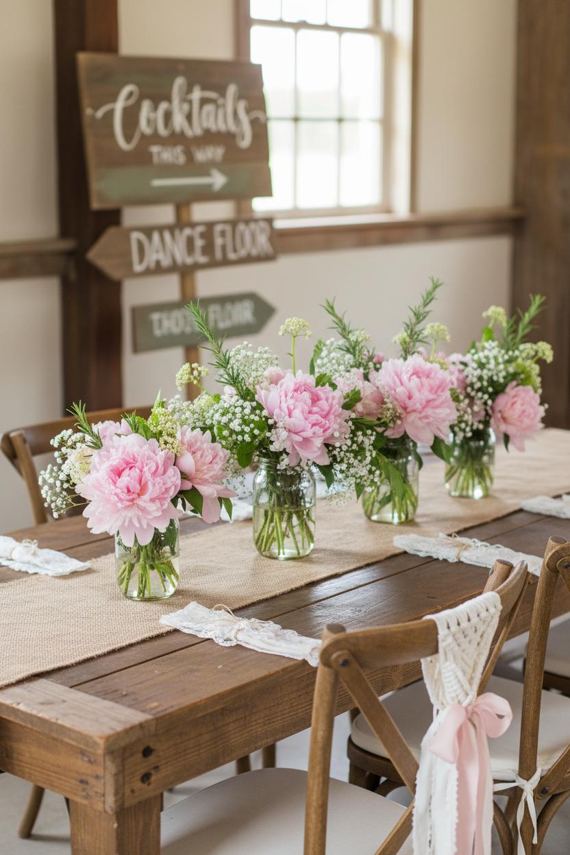 If you’re leaning into a boho country wedding vibe, mix clear jars with amber glass and a touch of macramé, then scatter polished stones or wood beads around the base for an earthy finish. For table numbers, slide a card into a tiny stand or lean it against wooden wedding signs to keep everything cohesive without cluttering the centerpiece. These DIY wedding decorations work beyond the dinner tables, too—line your ceremony aisle with glowing jars, mark the guest book and dessert stations with mini clusters, and style your escort card display with a long row of twinkling light-filled jars. Because mason jar centerpieces are modular, you can scale up or down to fit any table size and swap in seasonal accents: pinecones for fall, seashells for summer, or silk peonies for spring. The best part is the glow: gentle, golden light that turns a simple barn into a warm, welcoming haven—proof that you don’t need much more than a few thoughtful details to set the scene for a night you’ll never forget.