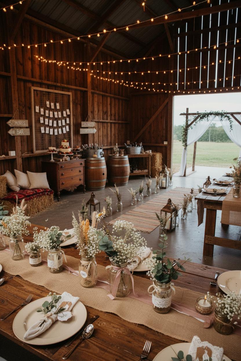 For the ceremony, an arch crafted from reclaimed doors or simple timber can be draped with gauzy fabric and strands of eucalyptus for an organic focal point. Line the aisle with lanterns and tucked-in jars of dried grasses, or layer mismatched rugs for a soulful, boho nod. At cocktail hour, flip wine barrels into high-top tables and corral drinks in galvanized tubs; hang escort cards on a chicken-wire frame with tiny clothespins. Inside, continue those rustic wedding ideas with clusters of mason jar centerpieces down the tables, the burlap table runner anchoring the look, and overhead swags of string lights warm white for that golden-hour glow all night long. Accent corners with a lounge of kilim pillows and quilts over hay bales. A dessert display on an antique dresser, flanked by wooden wedding signs, becomes an instant photo moment. Mixing real stems with baby’s breath artificial flowers keeps arrangements full and budget-friendly—no wilting worries. With these DIY wedding decorations, your barn wedding decor sets the tone for a boho country wedding that’s laid-back, romantic, and wildly memorable—think barefoot dancing, clinking mason jars, and stars winking through the rafters.