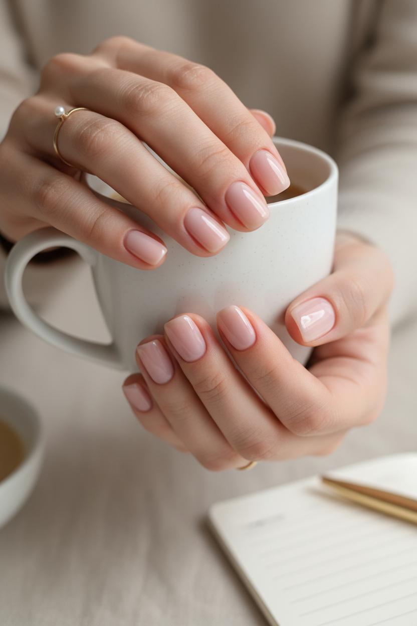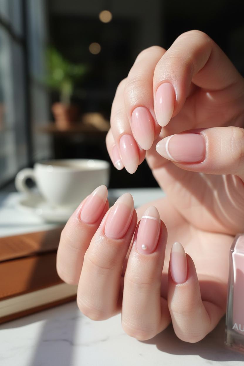 Style it simply or add tiny details for modern nude nail ideas: a micro-French with a soft white whisper at the tip, a negative-space half-moon, or a single dot accent near the cuticle. Start with a ridge-filling base to blur texture, float on two thin coats of sheer pink, then seal with a glossy topcoat and cap the free edge for chip resistance. Keep cuticles hydrated with oil so the pink looks even fresher. The beauty of sheer pink is how forgiving it is—no harsh grow-out lines, no fuss, just your nails, but better. Consider it the capsule piece of nail polish for short nails: timeless, flattering, and always in style.