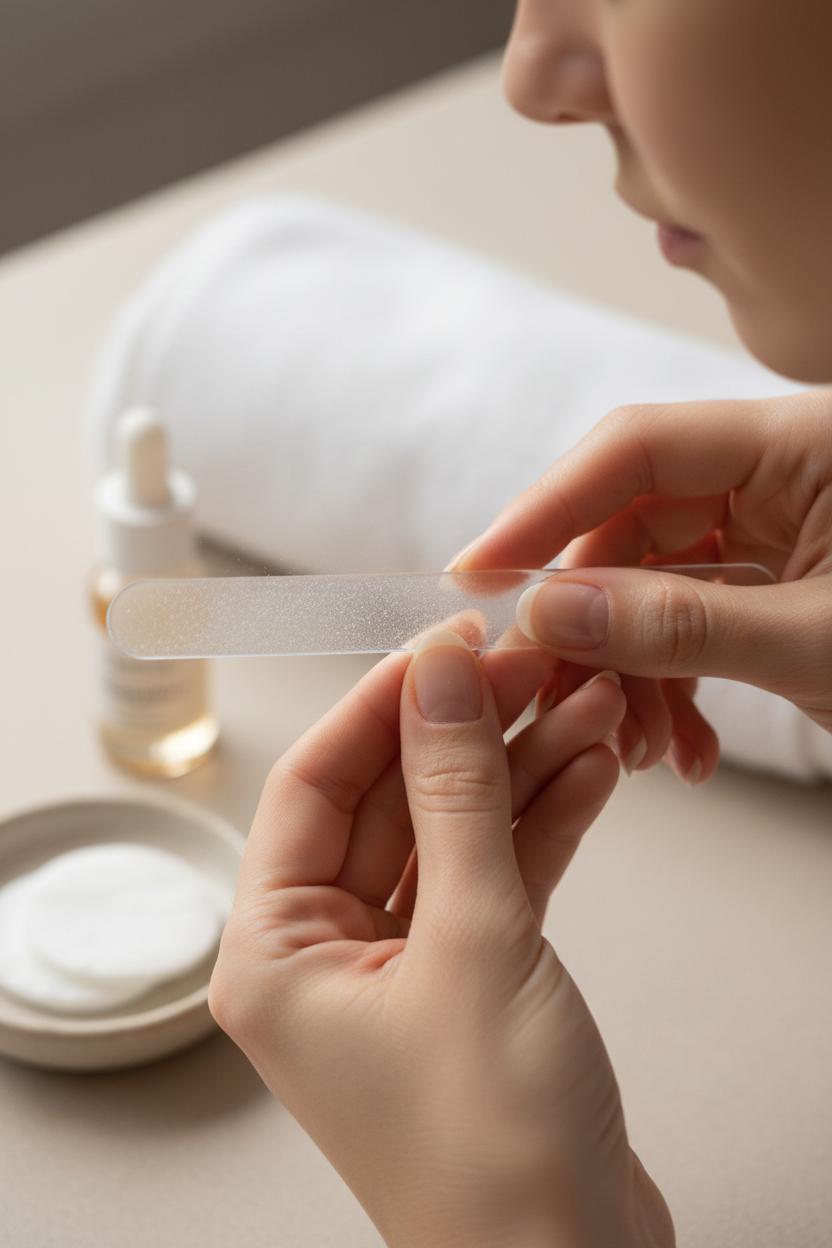 Before color or shine, it’s all about the shape—and for short natural nails, a glass nail file is your secret whisper-soft sculptor. Always start dry so the keratin layers stay intact, then hold the file at a slight angle and glide in one direction, never sawing. Think of rounding the corners of a postcard: gentle, consistent strokes that turn edges soft and wearable. A soft square or subtle oval (the beloved squoval) flatters shorter lengths and instantly gives that clean girl nails energy—polished yet effortless. Pause after a few passes to look at your hands at arm’s length; symmetry is easier to spot from a little distance. When you’re happy, lightly “seal” the tip by running the glass nail file straight down the free edge to close any tiny layers and prevent peeling. Rinse the file under water to keep the surface pristine for next time.