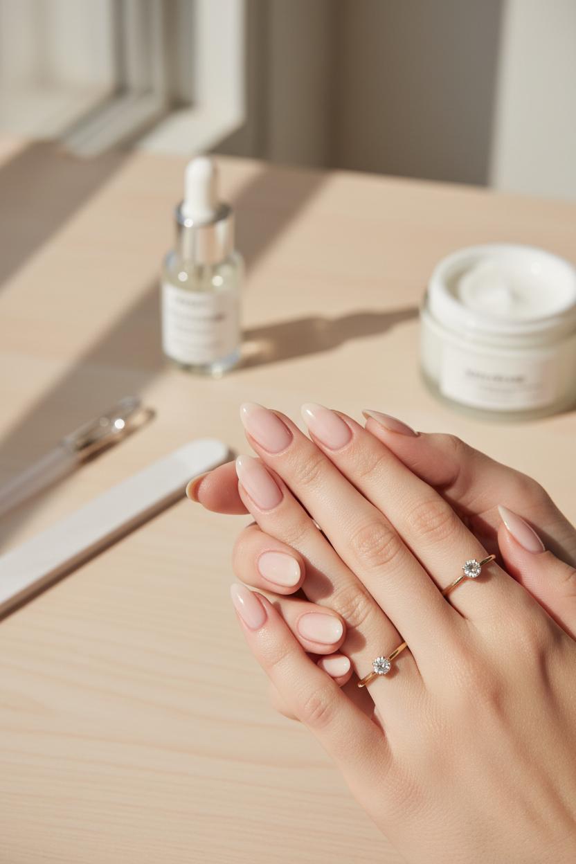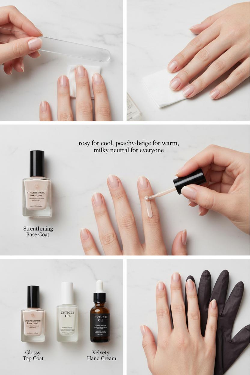 Prep is everything. Start by washing and thoroughly drying your hands—skip soaking, which can cause swelling and lead to chipping later. Shape with a gentle glass nail file, moving in one direction for that crisp, even edge that makes short lengths look intentional. Soften and tidy cuticles, then press back lightly; a drop of cuticle oil here helps everything look plush and cared-for. For strength and that lit-from-within glow, lay down a strengthening base coat, then float on one to two thin coats of sheer nude polish, sealing the free edge with each pass. If you prefer the bare look, a buff-and-oil moment can be just as glossy; if you love a hint of tint, choose a breathable nude nail polish that matches your undertone and finish with a quick-dry top coat. Once fully set, massage in hand cream so the skin looks as fresh as your nails.