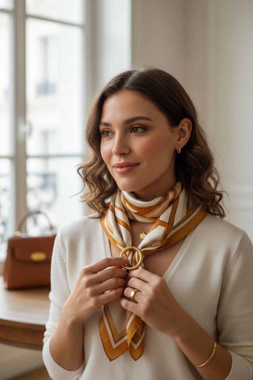 When you’re building a chic silk scarf outfit that feels straight off a Paris sidewalk, start by deciding what you want your scarf to do for you—whisper or make a statement. A square silk scarf is about shape and versatility: fold it on the diagonal, knot it close at the collarbone, thread it through belt loops, or wrap it around a ponytail. Sizes around 27–35 inches are the sweet spot for scarf styling; smaller reads like a neckerchief, larger gives you those effortless, drapey ties you see in french girl style. If you love clean, polished knots, a simple scarf ring turns a square into a necklace in seconds, keeps the ends even, and adds a tiny glint without feeling fussy.