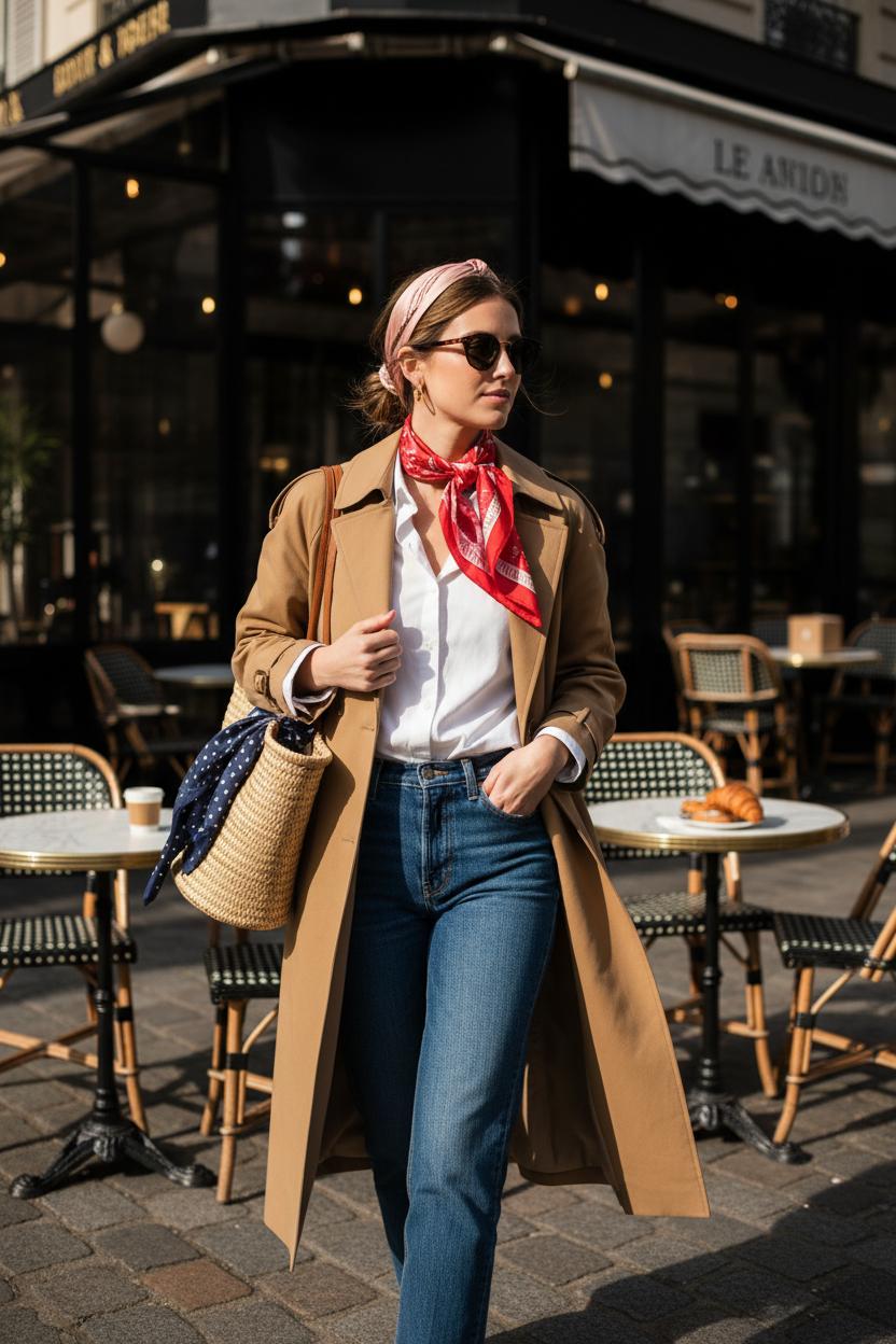 Consider this your gentle sign to knot a silk scarf outfit and let everyday basics feel instantly elevated. From classic neck ties to ponytail bows, our scarf styling tips prove that french girl style thrives on ease: denim, a tee, a trench, and one chic flourish. Build it into your capsule wardrobe to stretch outfits through spring fashion and beyond. So brew a cafe au lait, grab your favorite red lip, and step out with soft confidence—the streets are your runway, and your scarf is the encore.