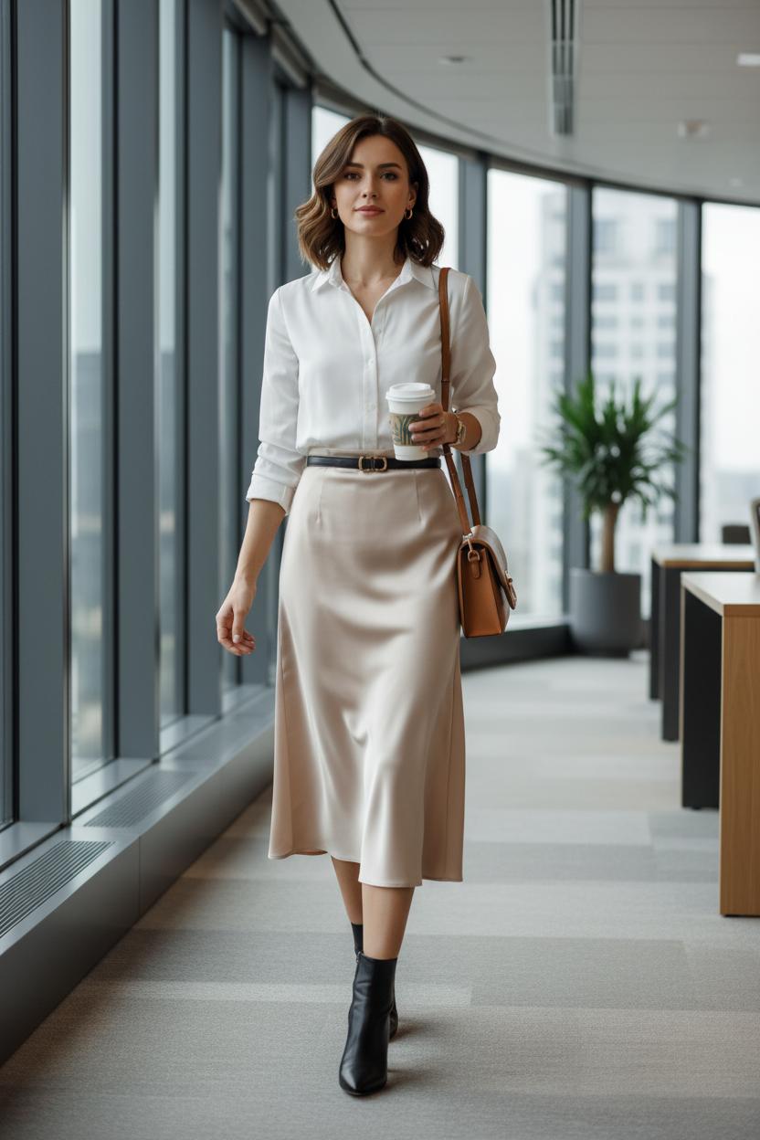 Of all the skirt outfits I reach for, nothing beats the ease of a midi that glides from Monday meetings to Saturday strolls. For the office, start with a satin midi skirt in a soft neutral that adds just a hint of shine without stealing the show. Tuck in a crisp button-down or a lightweight knit sweater women love for that refined-meets-relaxed balance, and slip on a shaping slip to keep everything smooth under the fabric. Add a sleek belt, minimal hoops, and a structured leather crossbody bag so your hands are free for coffee and commutes. On your feet, ankle boots for women are an instant polish move in cooler weather, while block-heel pumps keep things classic and comfortable.