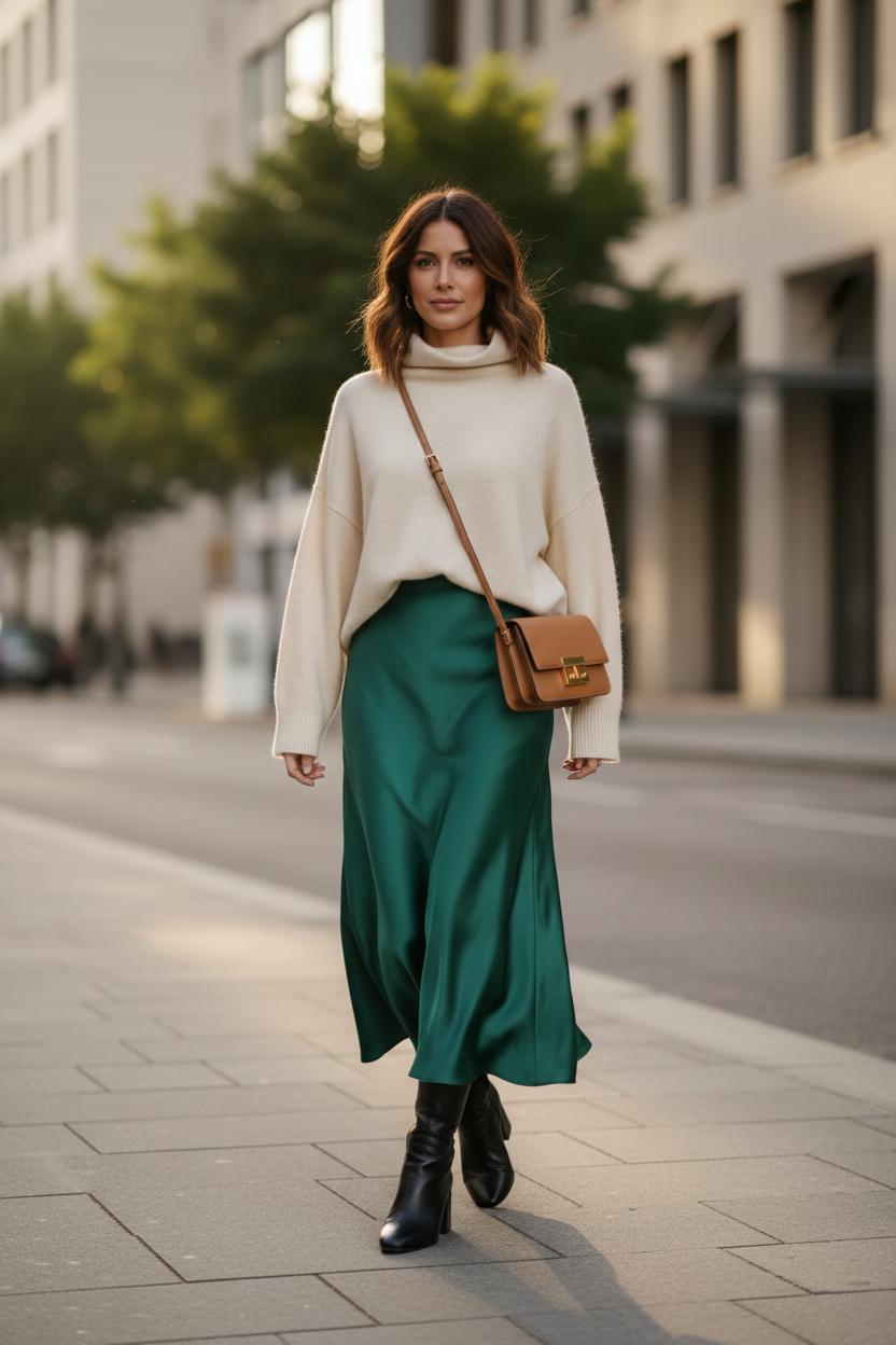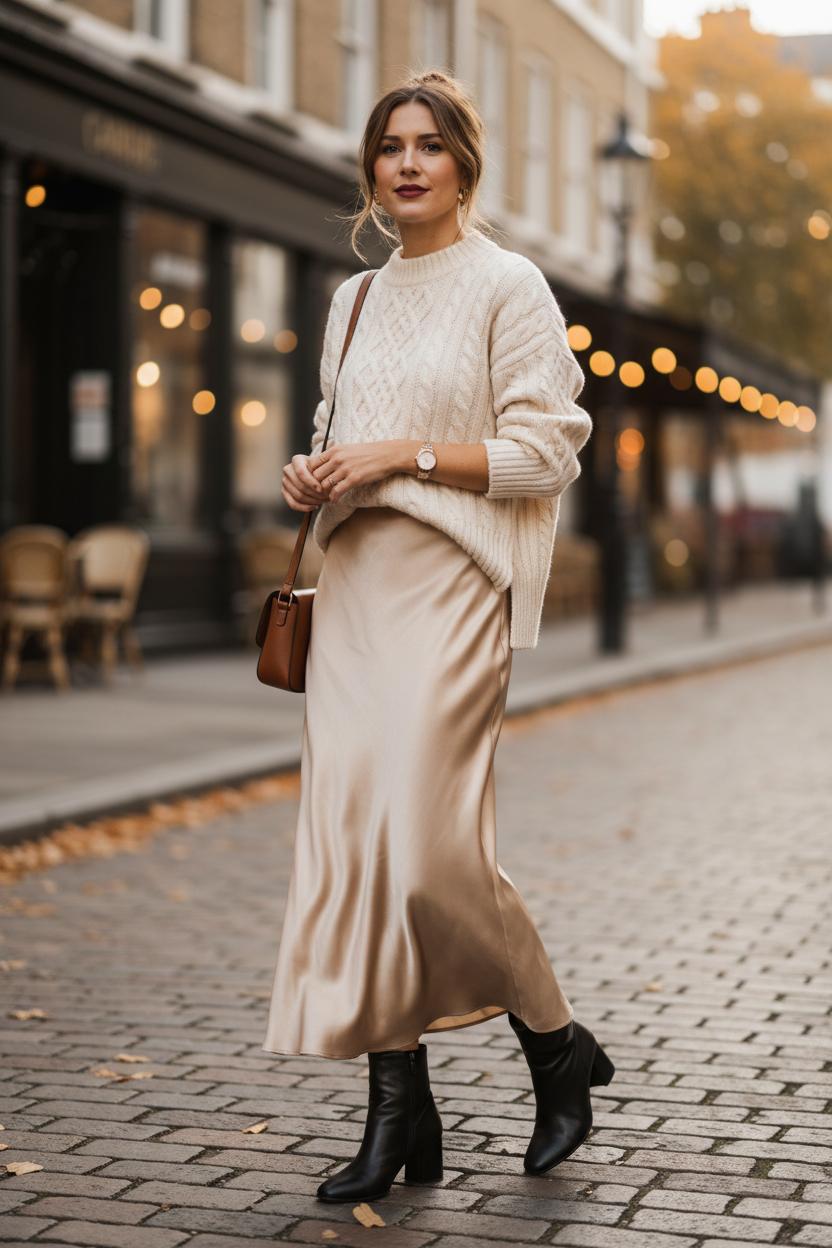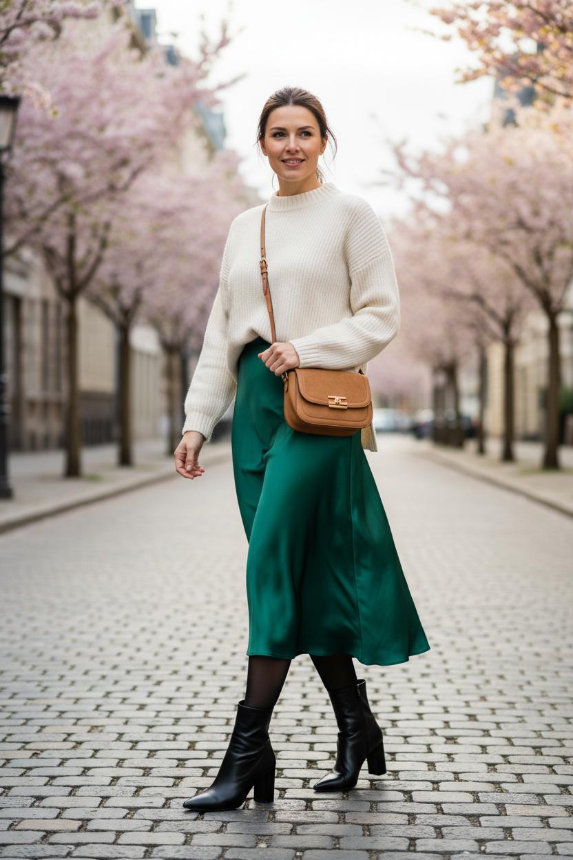 For midi magic, nothing beats a satin midi skirt grazing the calf and catching the light as you move. It’s the hero piece of so many midi skirt outfits, especially when teamed with a chunky knit sweater women love in a creamy neutral or soft heather gray. The contrast—shimmer and fluff—feels modern and romantic all at once. Finish with ankle boots for women to ground the look; a sleek pair adds edge, while a block heel keeps things daytime-friendly. Sling on a leather crossbody bag and you’re out the door with that I-just-threw-this-on energy. Color-wise, think tonal layers (oatmeal, stone, camel) for an elevated vibe, or let a jewel-toned knit pop against a champagne skirt. If your sweater is longer, belt it at the waist or do a front tuck to keep your lines clean.