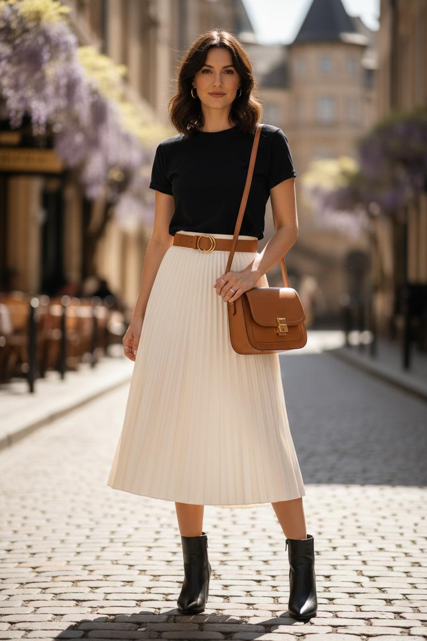If you’re craving a fresh twirl factor, start with pleats. They’re the easy upgrade for skirt outfits because they catch the light and movement in that just-right way. For daytime, try a crisp pleated number with a fitted tee, a waist-defining belt, and ankle boots for women to ground the floaty texture. If you prefer more polish, a satin midi skirt with soft knife pleats feels dressy without trying too hard—just tuck in a silky blouse and add a leather crossbody bag for a streamlined finish. Pro tip: a shaping slip under lightweight fabrics keeps everything smooth so the pleats can do the talking. For midi skirt outfits at the office, layer a cropped cardigan or tailored blazer; for evenings, swap in a slinky cami and delicate earrings and you’re suddenly cocktail-ready.