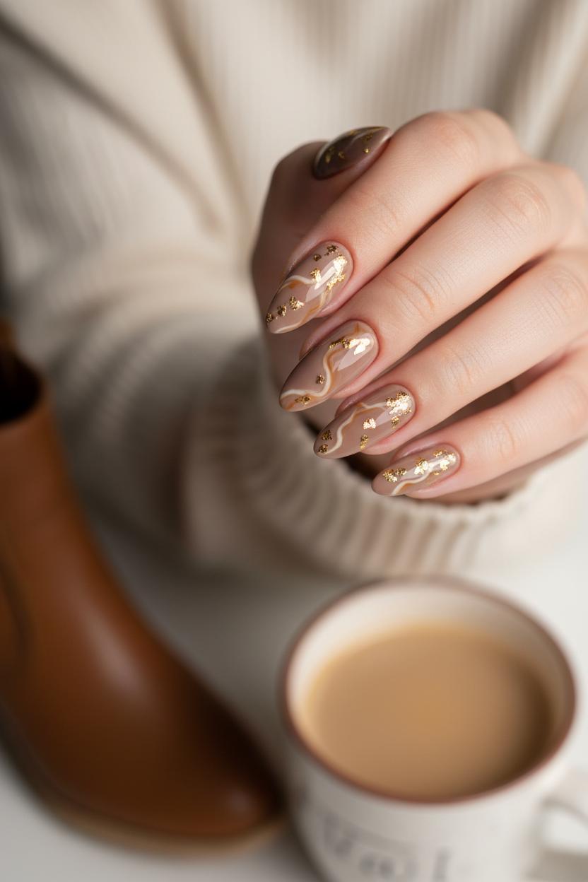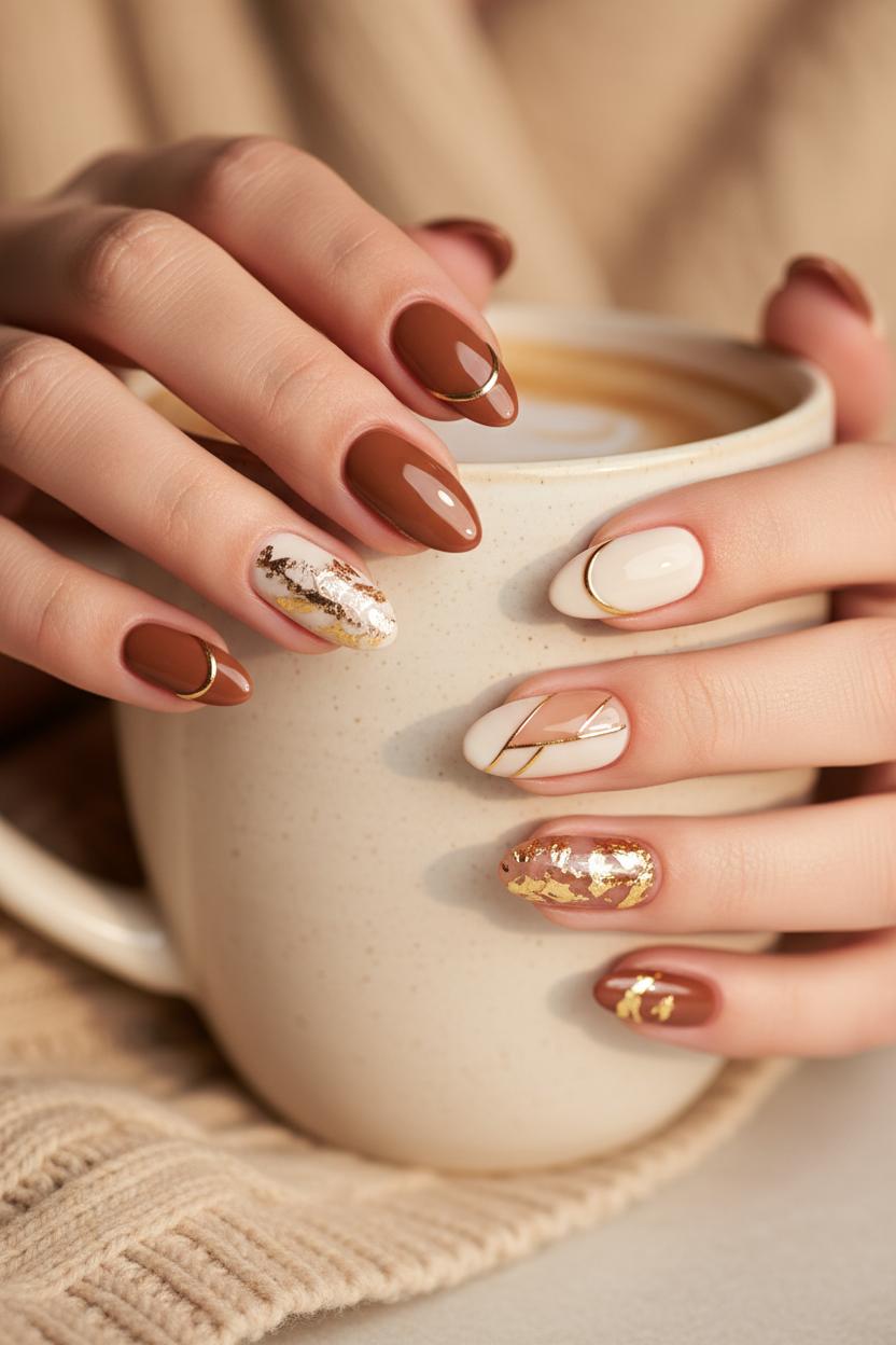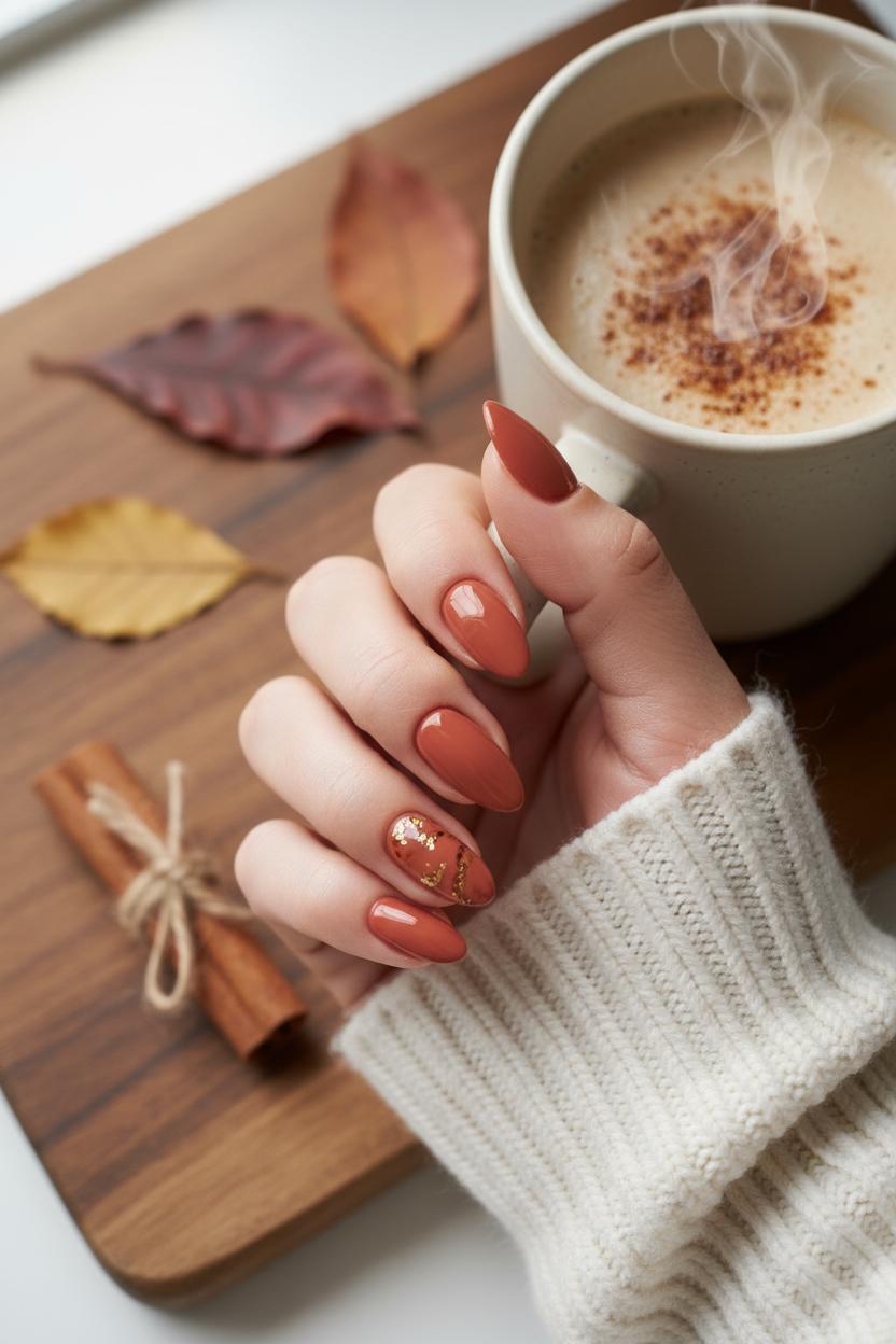 Ready to lean into latte art with a little more drama? Try tonal swirls—cinnamon, cocoa, and cream ribbons that drift across two or three nails—leaving the rest glossy and clean. A tortoiseshell accent over a cinnamon base adds café-core depth, while a matte topcoat turns spice shades velvety and luxe. For a touch of light, press a few flecks of gold nail foil onto one corner like scattered cinnamon sugar; the torn edges catch the light and make even simple nail art ideas feel intentional. A glazed cinnamon chrome finish layered over mocha brown is another mid-max moment that looks incredible on almond nails, especially when paired with a single foil-kissed cuticle highlight.