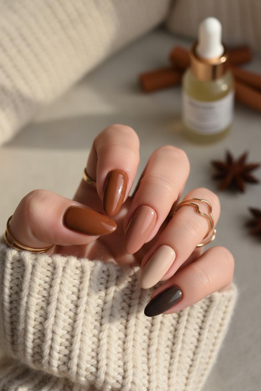 Cinnamon spice fall nails with warm brown and amber tones — trendy autumn manicure idea inspired by cozy seasonal colors.