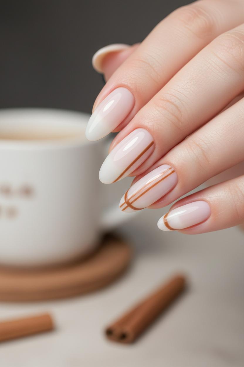 If you love the idea of cinnamon without the sugar rush, start minimal with a sheer milky base and the faintest spice-toned detail. Think latte-nude polish with a skinny caramel French, or a single cinnamon stripe hugging the sidewall for that “barely there” latte art vibe. Neutral nail colors like chai, taupe, and soft gingerbread flatter almond nails and feel office-ready while still whispering fall. A precise micro-French or negative-space swoop is easier than it looks with a steady brush from your gel nail kit, and if you’re growing out your shape, almond nail tips can give you that elongated, cozy-sweater silhouette instantly. Choose a fall nail polish in warm brown, terracotta, or maple for the base, and you’ve got a wearable autumn manicure that pairs with everything.