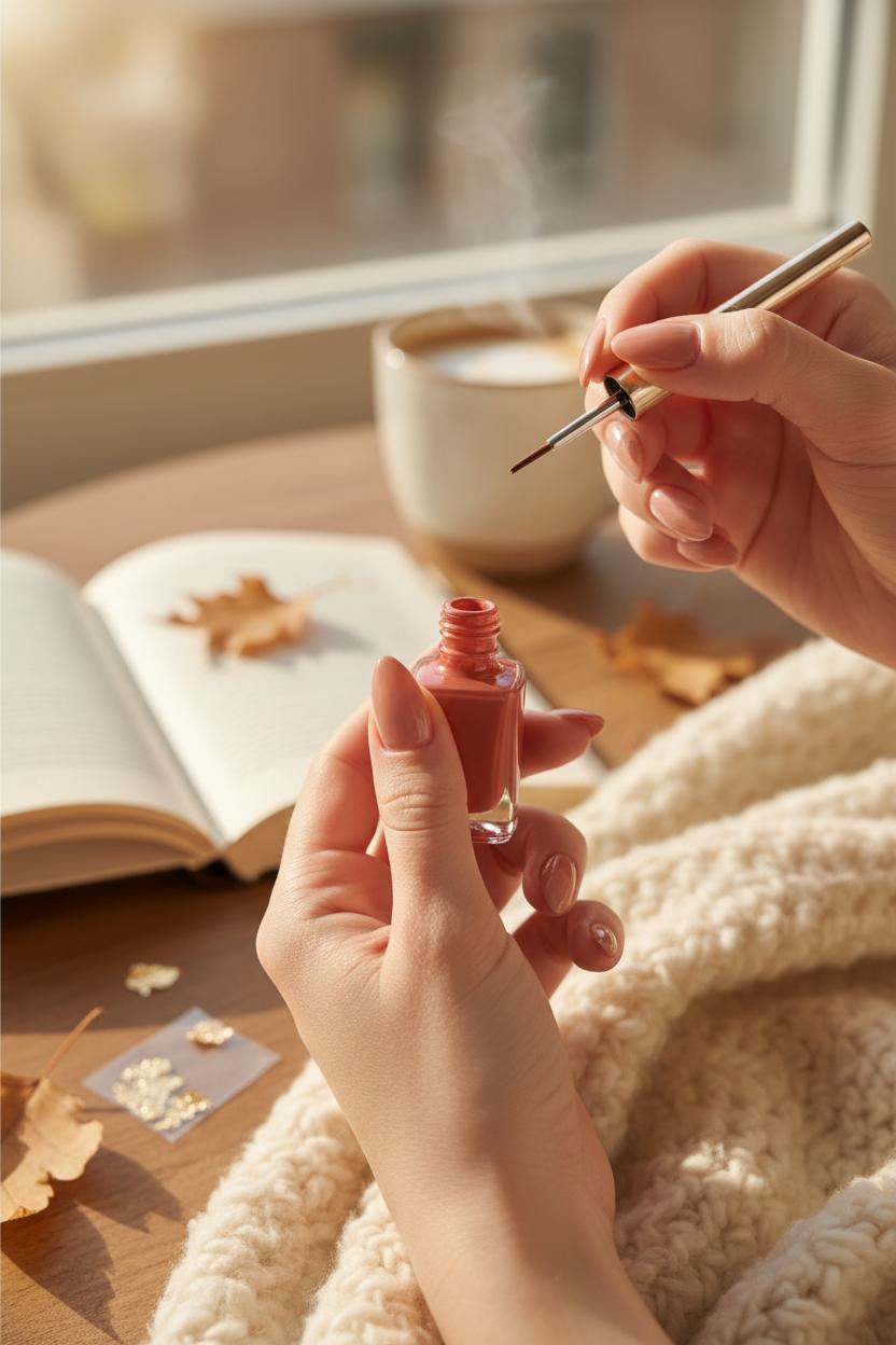 There’s something so satisfying about turning a cozy afternoon at home into a mini salon session, especially when you’re craving that cinnamon-spice glow for your fall nails. Start by shaping your nails into soft almond nails for an elegant, elongating effect—if you need a little boost, almond nail tips are a quick shortcut that still look natural. Prep is everything: push back cuticles, lightly buff, and cleanse so your gel polish adheres. Then reach for a gel nail kit and brush on a thin base coat, curing as directed. For color, lean into neutral nail colors with a seasonal twist—think latte beige, creamy caramel, warm taupe, or a spicy terracotta from your favorite fall nail polish lineup. Two thin coats, curing between each, will give you that smooth, glassy depth. If you’re feeling fancy, press a whisper of gold nail foil onto a couple of nails for a gilded-leaf effect; it’s the easiest way to make an at-home autumn manicure look editorial with hardly any effort.