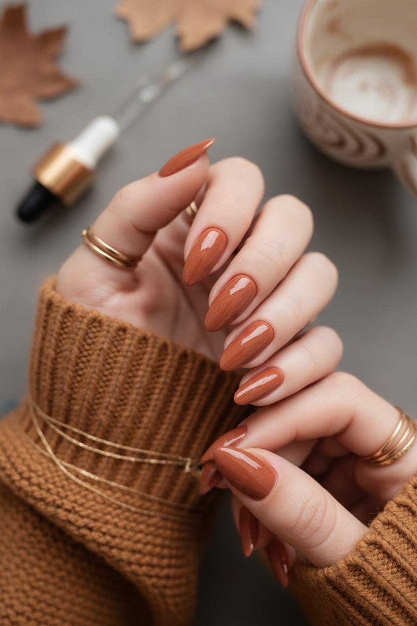For a DIY-friendly routine, a gel nail kit is your best friend: it lets you sculpt crisp sidewalls and seal in strength so the shape lasts through sweater season. After prep, cap the edges with your base and color to prevent chips, then finish with a glossy or velvet matte top. Between sets, massage in cuticle oil nightly to keep everything flexible and healthy. Shade-wise, opt for a “spice rack” palette of fall nail polish—think cinnamon brown, maple toffee, pumpkin nude, chai beige, and deep clove—tones that pair beautifully with knits and gold jewelry. Almond nails also love tonal gradients: paint each finger a different latte hue for an elevated, wearable autumn manicure that goes with everything.