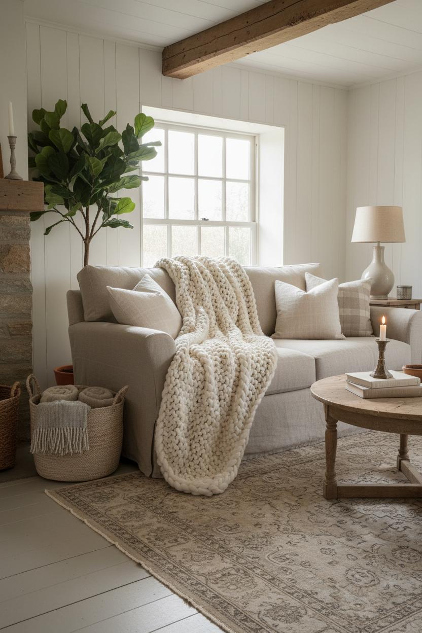 Nothing cozies up a space faster than texture, and a chunky knit throw blanket is the ultimate shortcut to instant, touchable warmth. Think creamy cables pooled across a linen slipcover sofa, soft braids catching the afternoon light, and that irresistible, marshmallowy heft that begs you to curl up. In a warm neutral decor palette—oatmeal, fawn, and soft taupe—the throw becomes a tactile focal point that anchors your cosy cottage living room without overwhelming it. Layer it over a vintage style area rug and add a few nubby pillows or a subtle plaid for that collected, cottagecore decor feel. A woven basket at the hearth keeps extra blankets within reach, while a faux greenery plant tucks life into the corner and softens edges. The look is equal parts rustic living room charm and Sunday-afternoon serenity: well-loved books on the coffee table, candlelight flickering, and textures that make even quiet moments feel special.